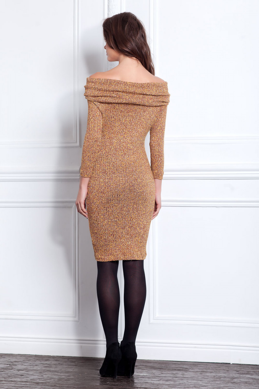 Притягательное трикотажное платье крупной вязки в рубчик. Модель облегающего силуэта с длинным рукавом. Открытая горловина лодочка с объемным воротником - хомут. Отличное решение на каждый день!