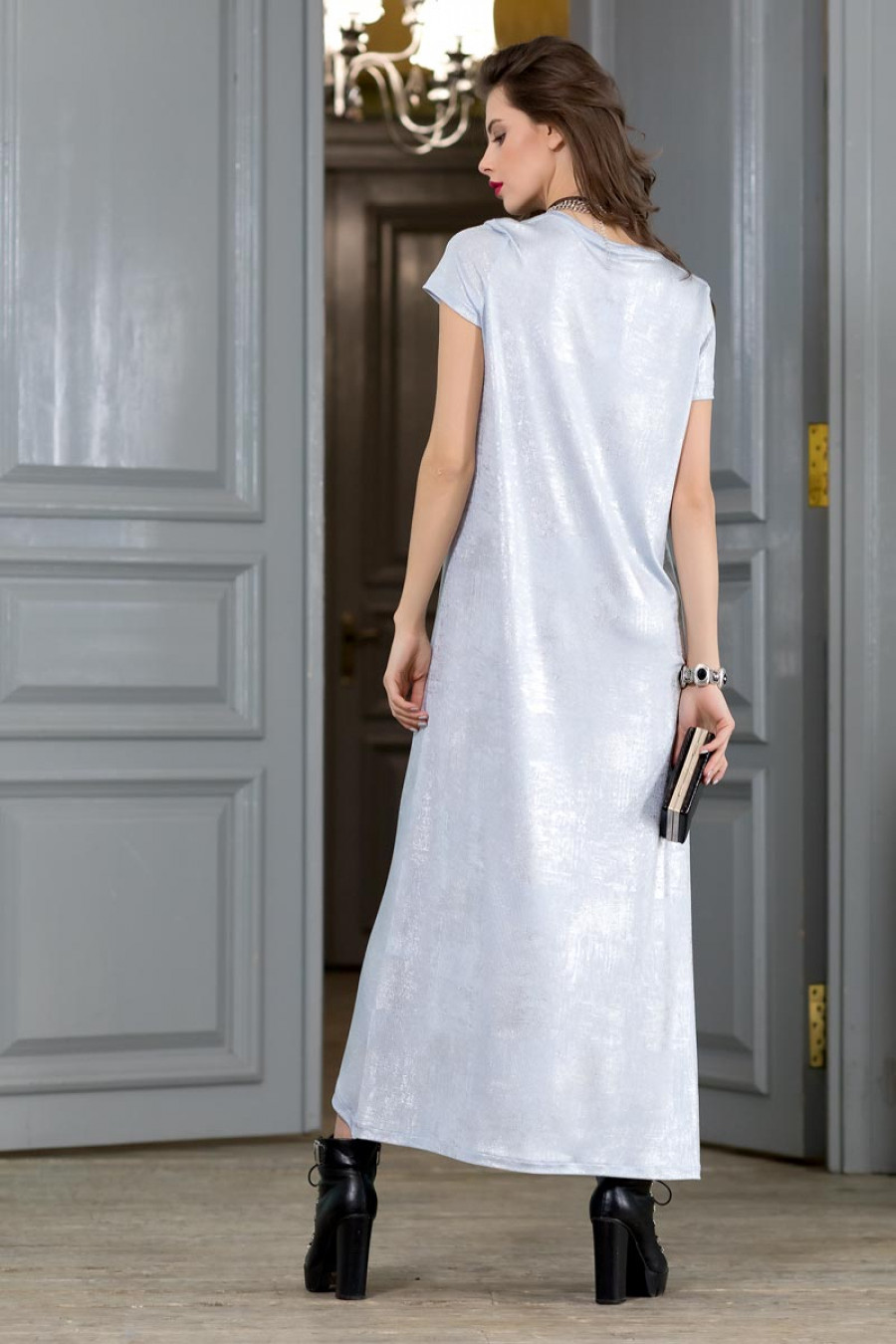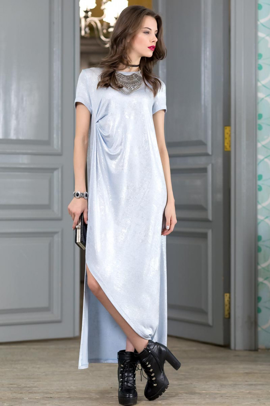 Стильное нарядное платье макси из трикотажа с мягким блеском люрекса. Прямой крой с эффектной драпировкой впереди, элегантный круглый вырез и короткие рукава подчеркивают сдержанность фасона. Идеально для коктейльных вечеринок и праздничных мероприятий.