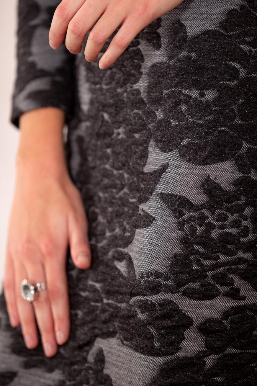 Элегантное и стильное платье из трикотажного жаккарда с цветочным монохромным рисунком. Модель прилегающего силуэта с рукавом 3/4. Вырез горловины лодочка подчеркивает красоту плеч. На шее однотонная стойка - имитация чокера, закрепленная со спинкой. Сза...