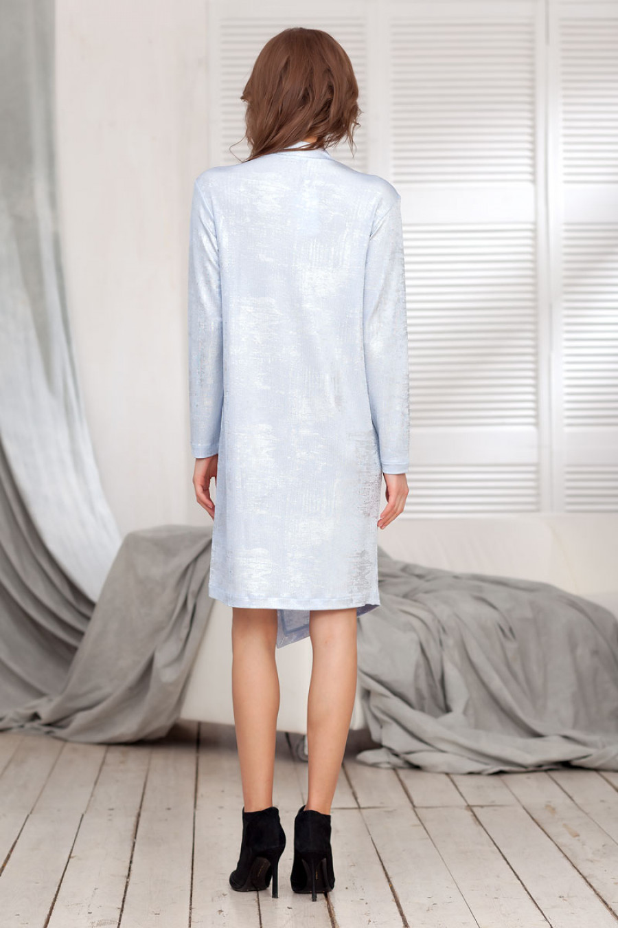Стильное платье из нарядного трикотажа с блестящим напылением. Модель свободного кроя с длинным рукавом. Перед выполнен двойным с асимметричной линией низа. По горловине драпировка "качели".
