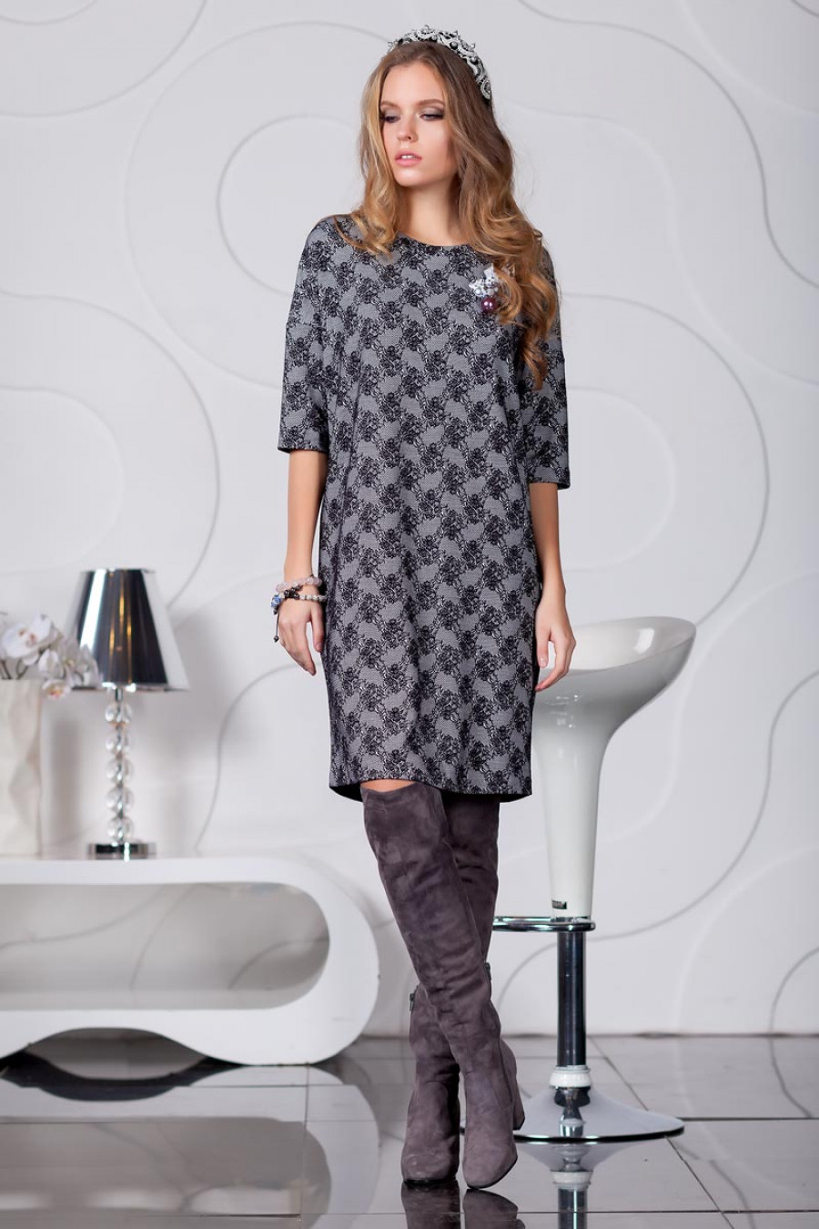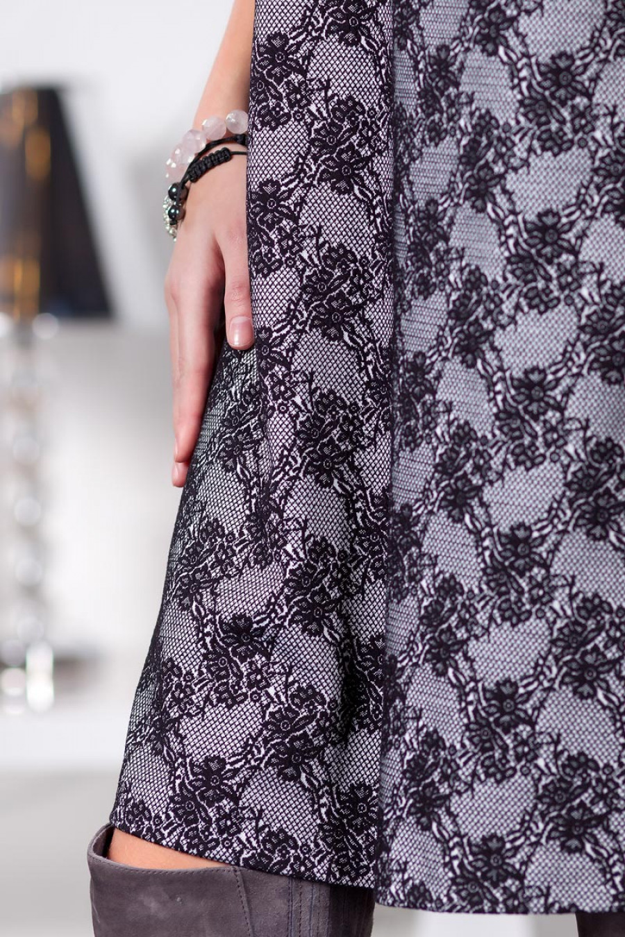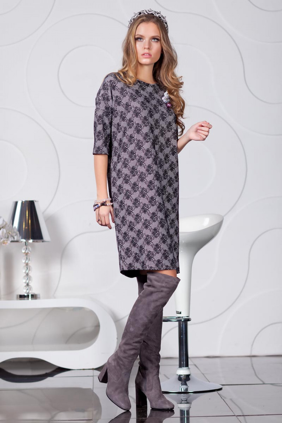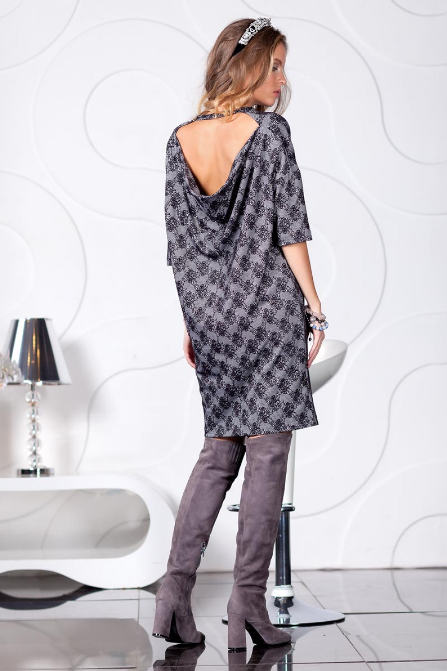 Стильное платье из трикотажного жаккарда с цветочным рисунком. Модель свободного кроя с коротким рукавом. Сзади декорировано драпировкой "качели".