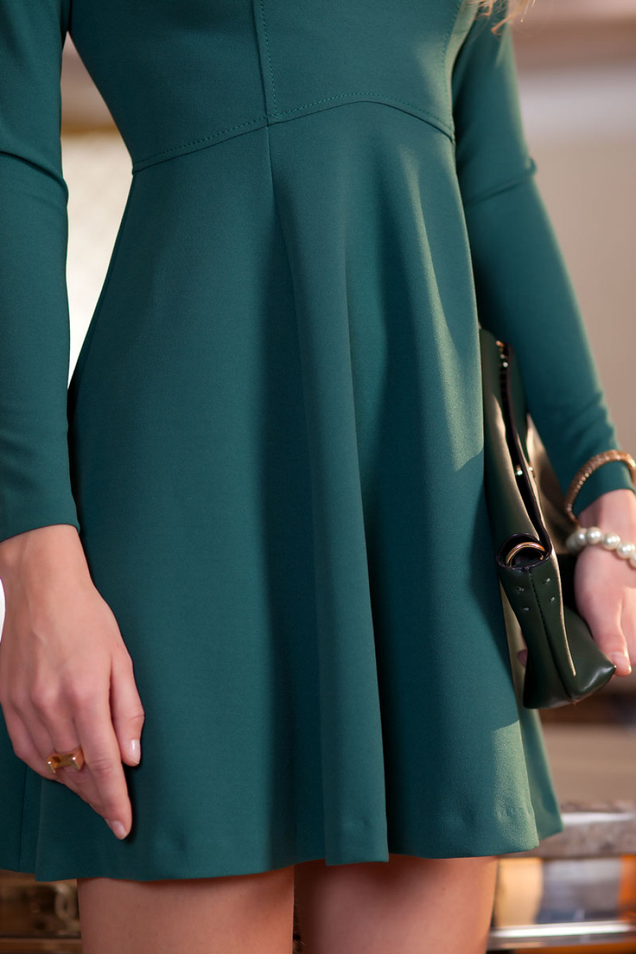 Элегантное платье из плотного однотонного трикотажа. Модель приталенного силуэта с длинным рукавом и юбкой клеш. Горловина оформлена аккуратной стойкой. Кокетка декорирована рядом пуговиц. Сзади застежка на потайную молнию.