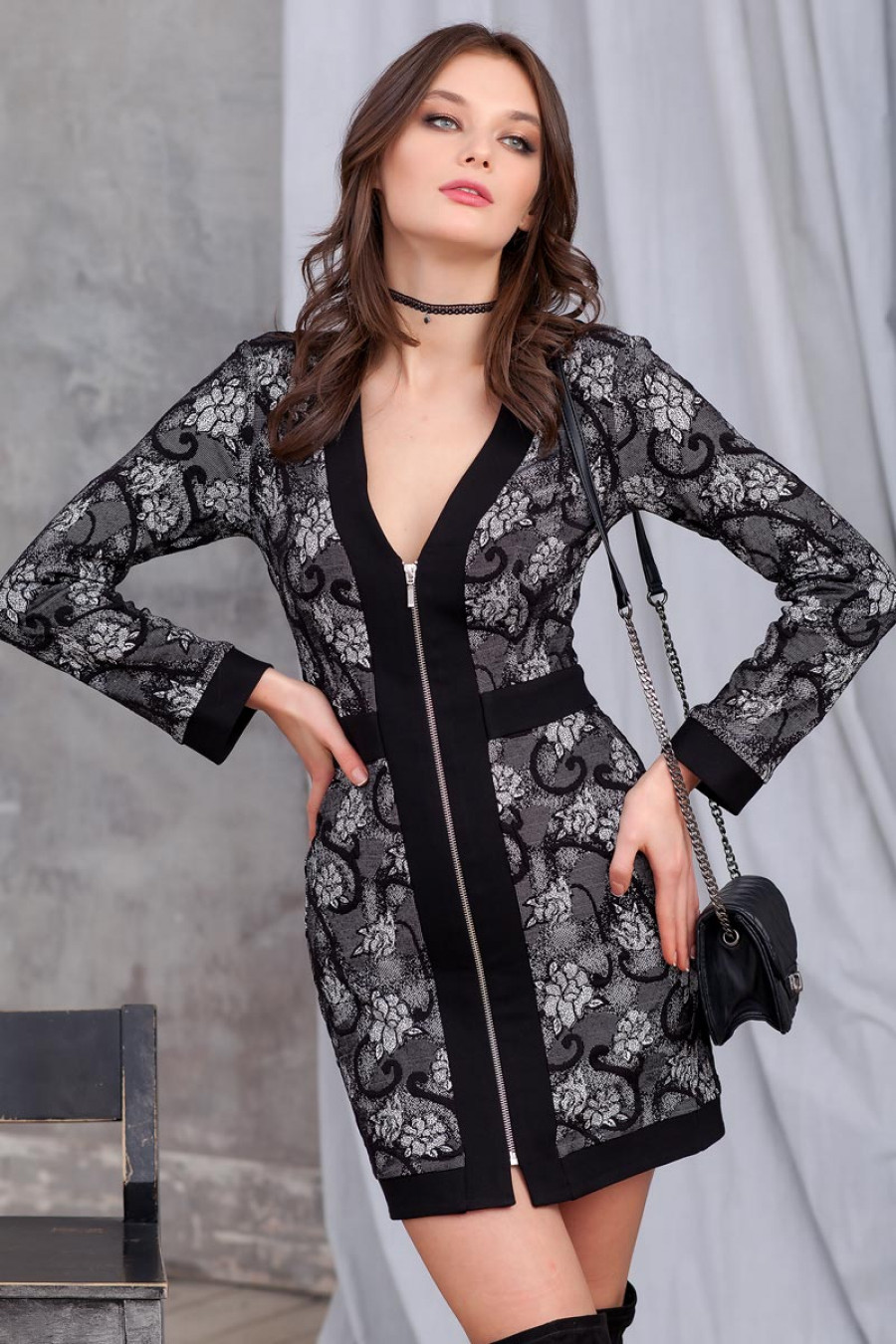 Эффектное платье из трикотажного жаккарда с цветочным рисунком. Модель прилегающего силуэта с длинным рукавом. Впереди застежка на металлическую молнию. Планки, пояс и манжеты выполнены из однотонного материала.