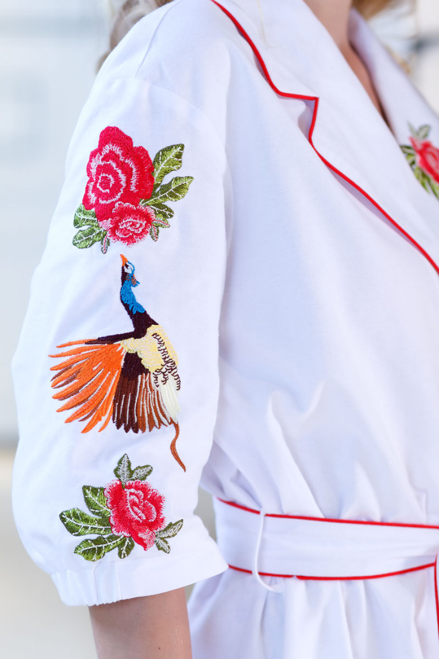 Стильное летнее платье макси из хлопка. Модель свободного кроя без застежки, завязывается поясом. Рукав 3/4 с манжетой. В боковых швах выполнены карманы. Эффектной отделкой служат контрастный кант и вышивка на лацкане и рукаве.