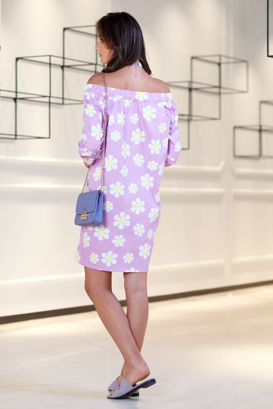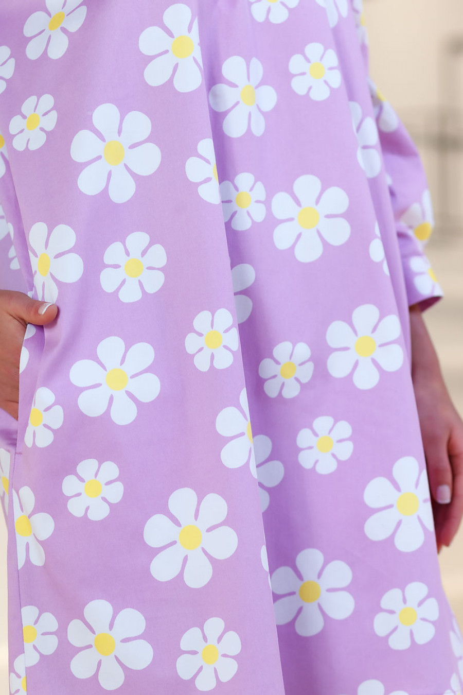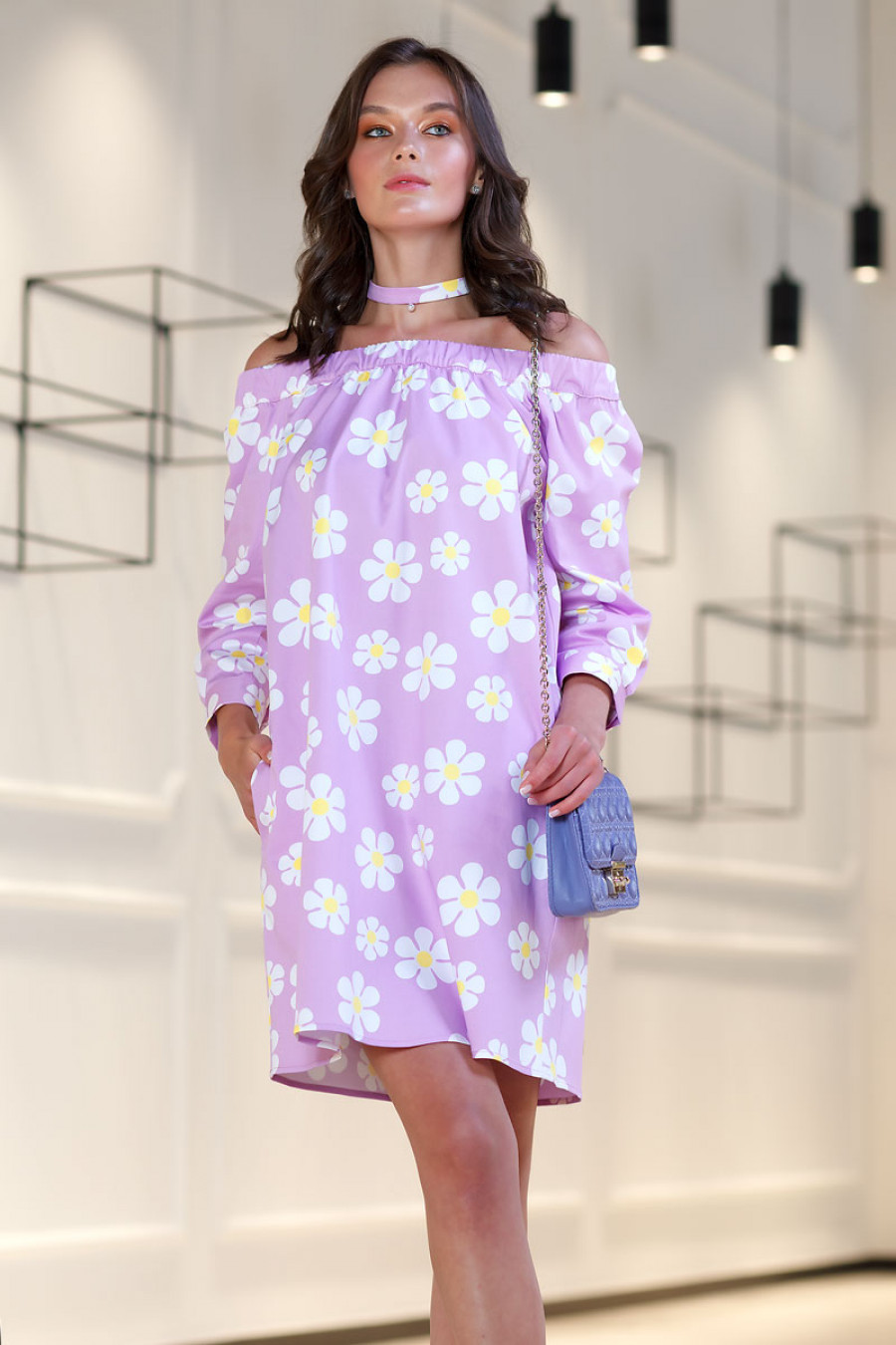 Стильное платье из плотного хлопка с ярким цветочным принтом. Модель свободного кроя с открытой линией плеч. В боковых швах выполнены карманы. Рукав 3/4 с манжетом. В тон к платью выполнен чокер.