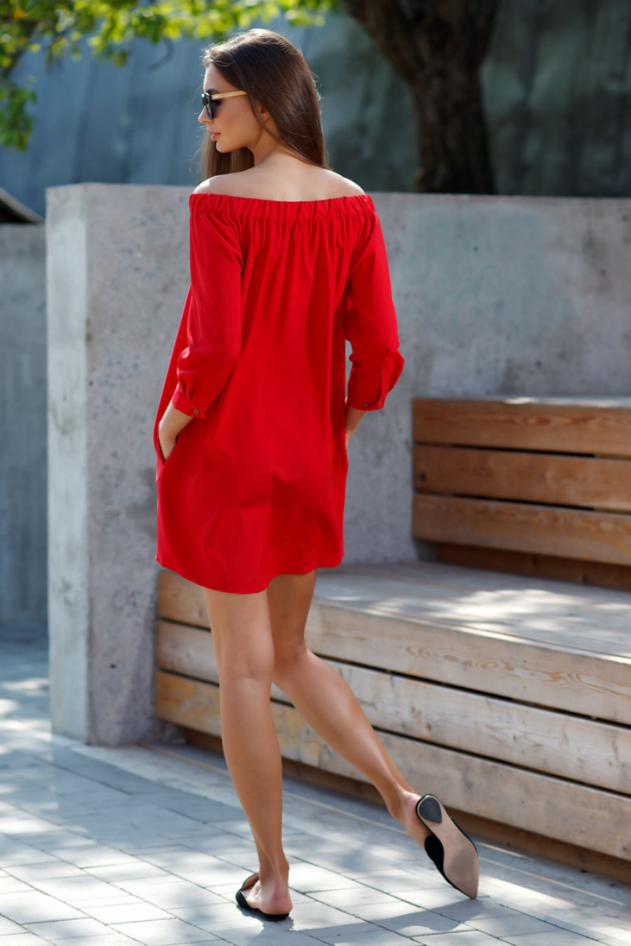 Стильное платье из однотонной ткани. Модель свободного кроя с открытой линией плеч. В боковых швах выполнены карманы. Рукав 3/4 с манжетой. Впереди застежка на пуговицы.