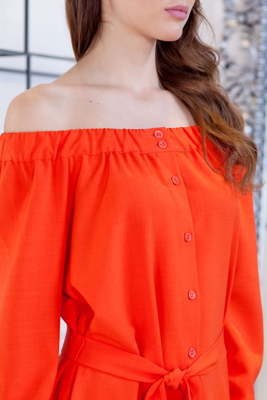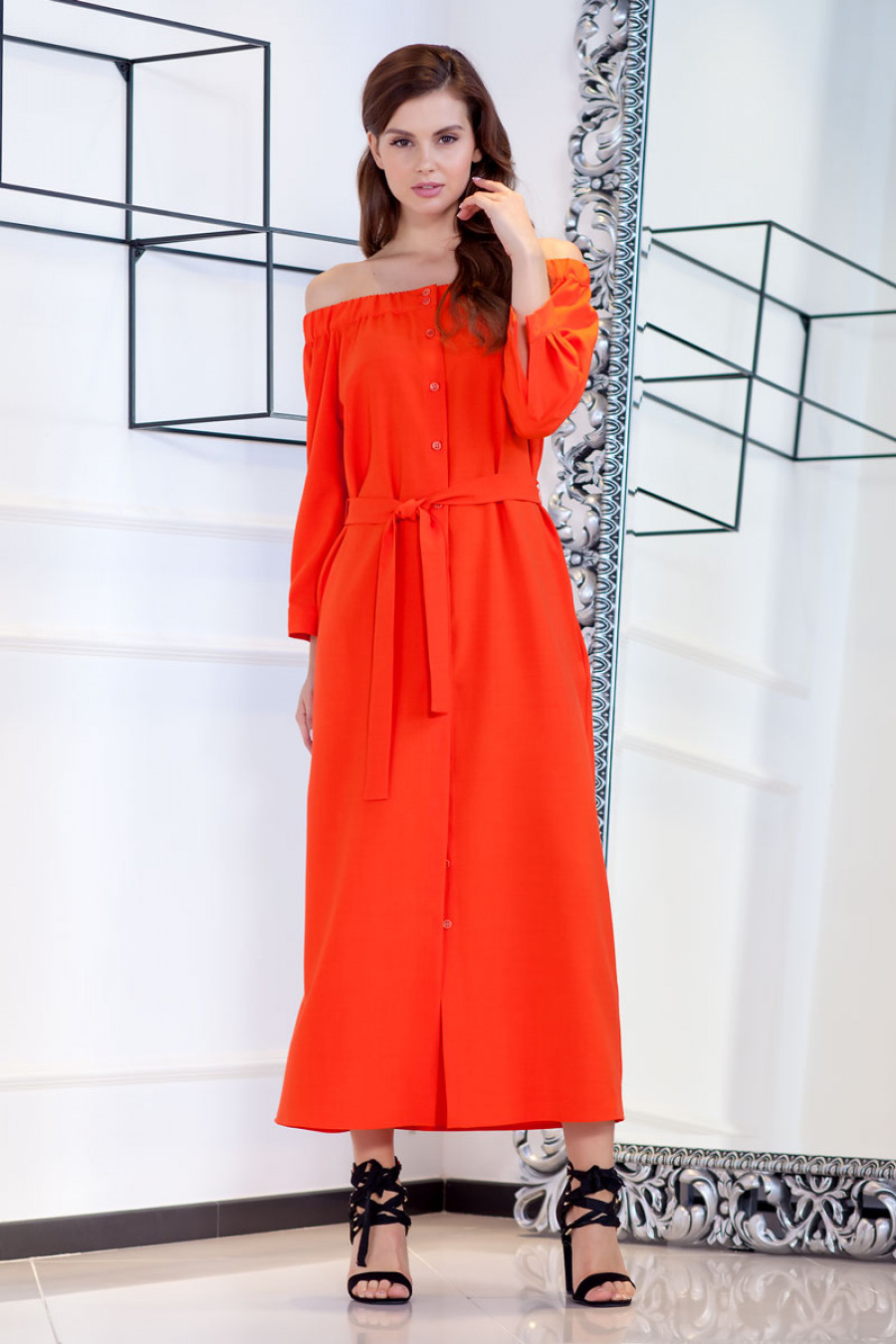 Стильное платье макси из однотонной ткани. Модель свободного кроя с открытой линией плеч. В боковых швах выполнены карманы. Рукав 3/4 с манжетой. Впереди застежка на пуговицы. На талии завязывается пояс.