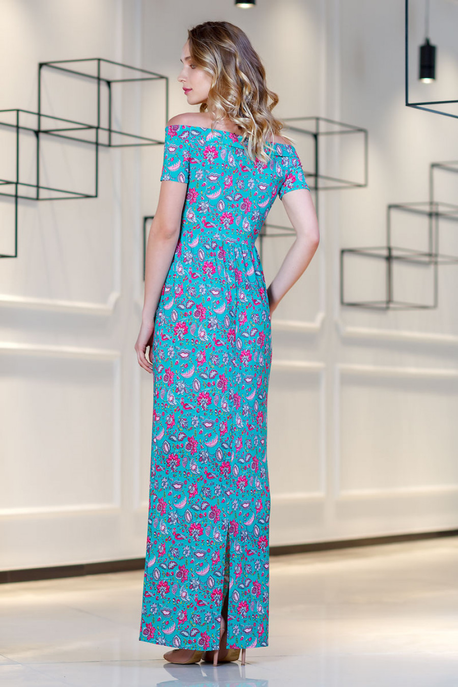 Стильное летнее платье с открытыми плечами из струящегося трикотажа с цветочным принтом. Модель приталенного силуэта с юбкой в пол. Сзади выполнен разрез. Верх платья собран на широкую резинку для удобства. Платье дополнено ремешком.
