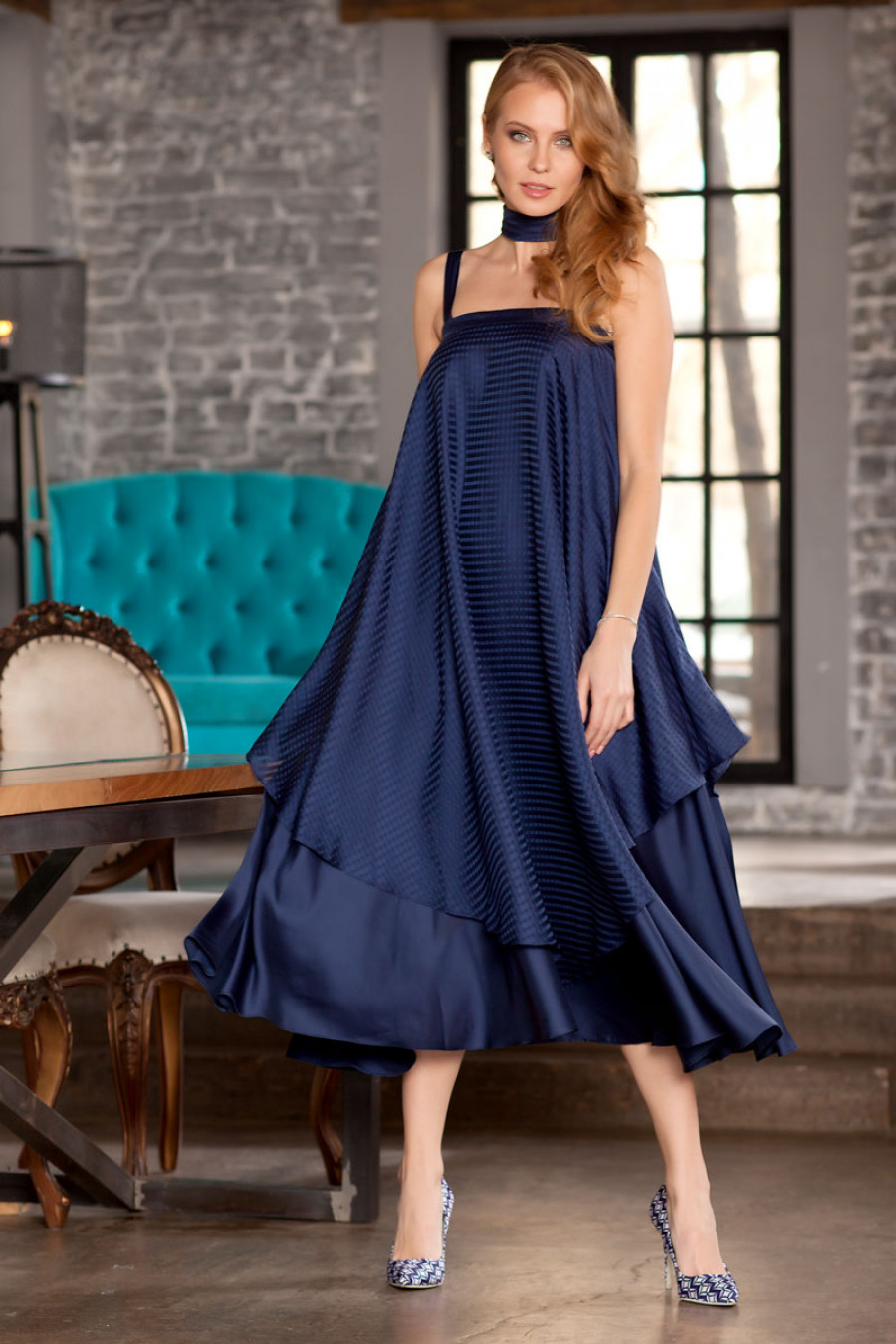 Эффектное платье-сарафан из шелковой ткани. Модель трапециевидного силуэта на широких бретелях с регулировкой по длине. Верхнее платье и шарф выполнены из шифона с рисунком в тон нижнего платья.