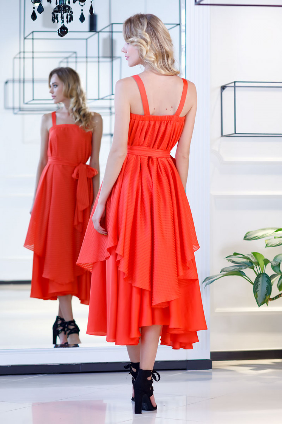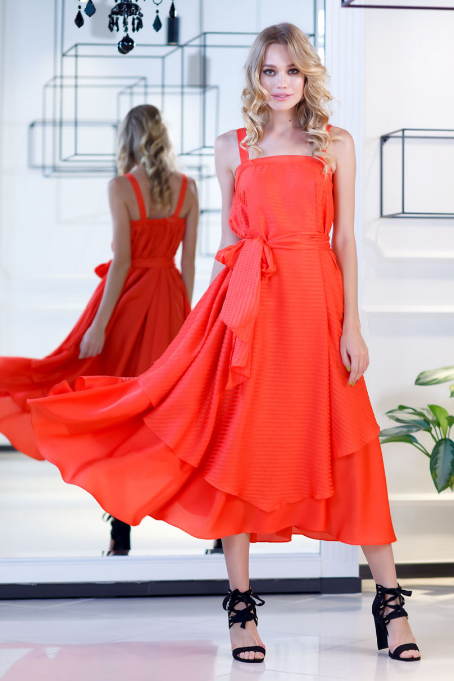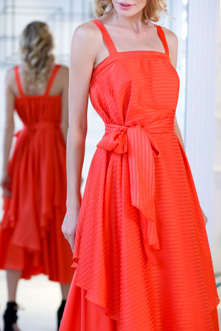 Эффектное платье-сарафан из шелковой ткани. Модель трапециевидного силуэта на широких бретелях с регулировкой по длине. Верхнее платье и шарф выполнены из шифона с рисунком в тон нижнего платья.