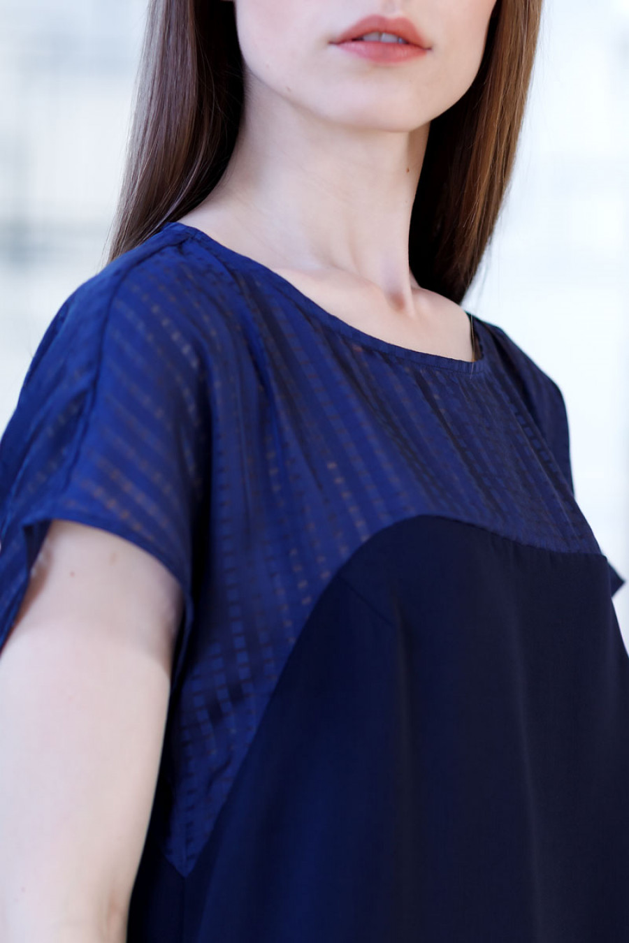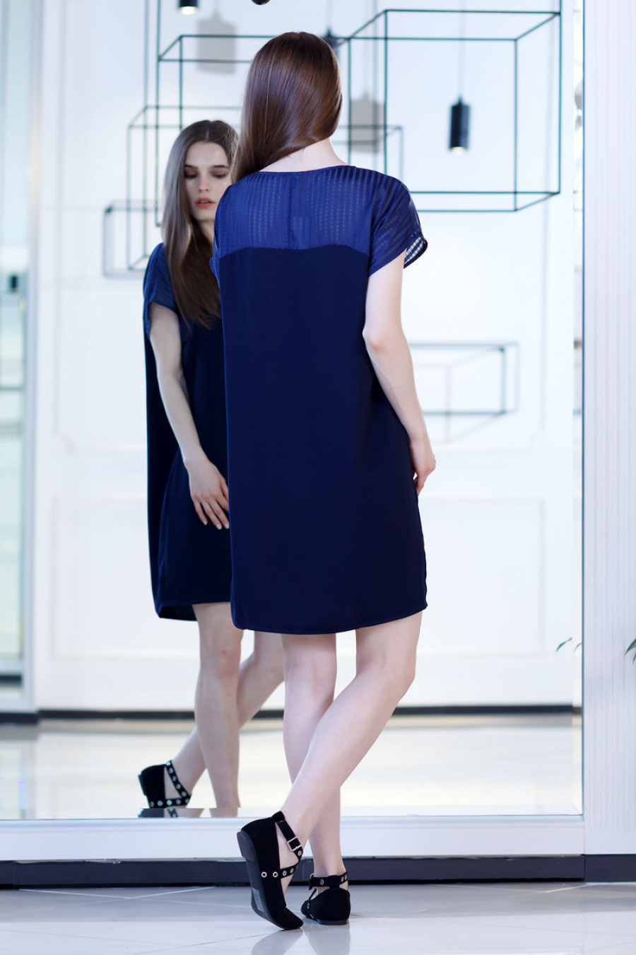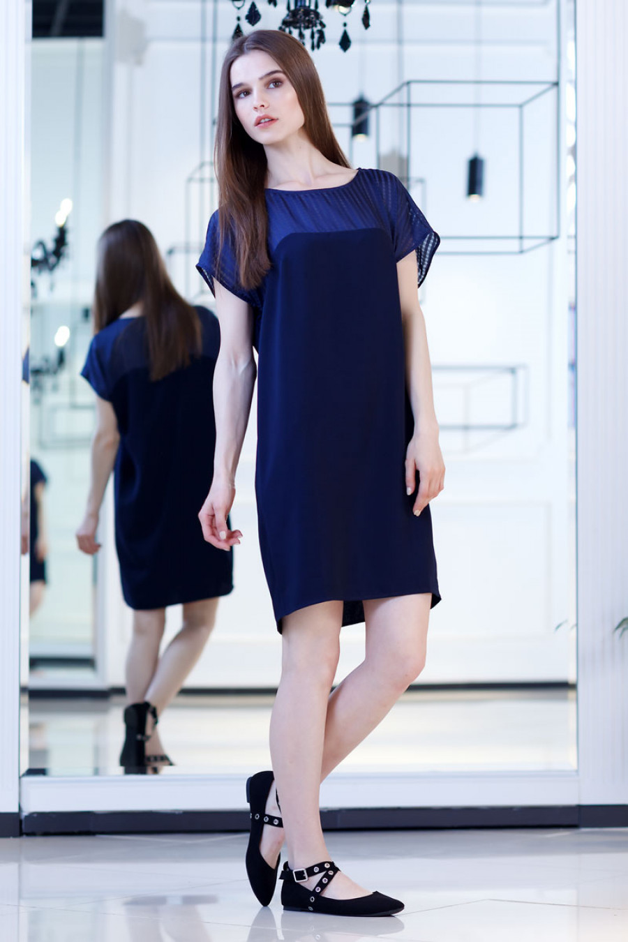 Эффектное платье выполнено в сочетании двух тканей: плотный низ и полупрозрачный шифон на кокетке. Модель свободного кроя с округлым вырезом горловины и спущенной линией плеча.