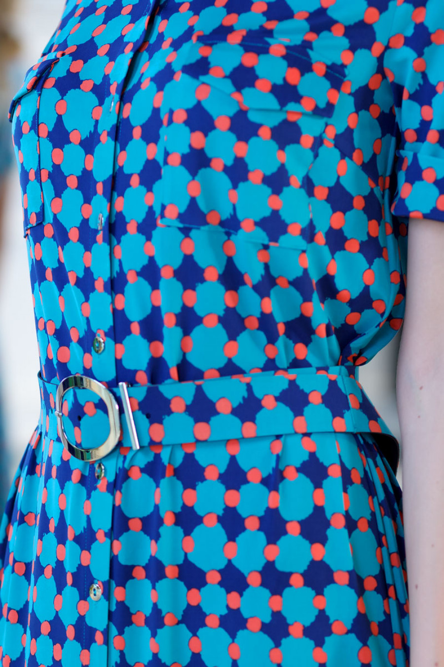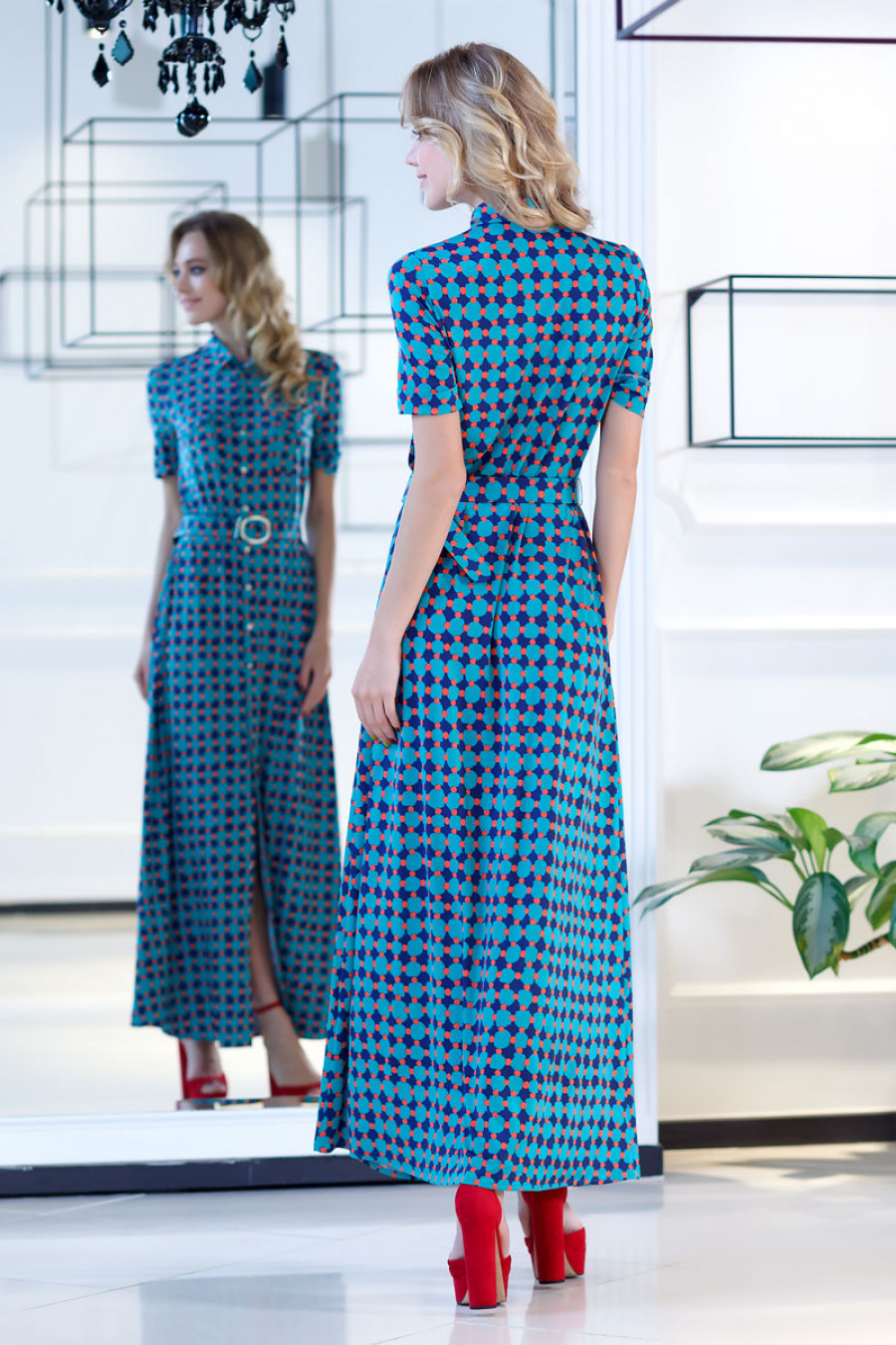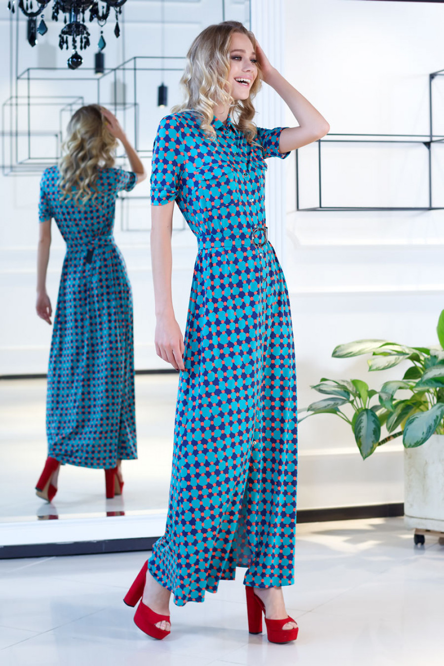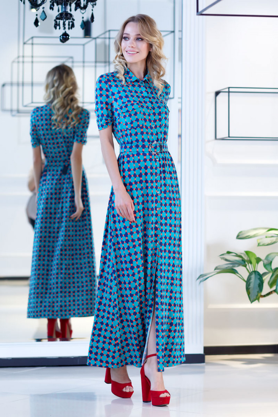 Элегантное платье макси из струящегося трикотажа с оригинальным принтом. Модель свободного кроя с расклешением книзу. Короткий рукав с манжетой. Горловина оформлена аккуратным воротничком. Застежка на пуговицы. В комплект к платью идет ремень в тон изделию.