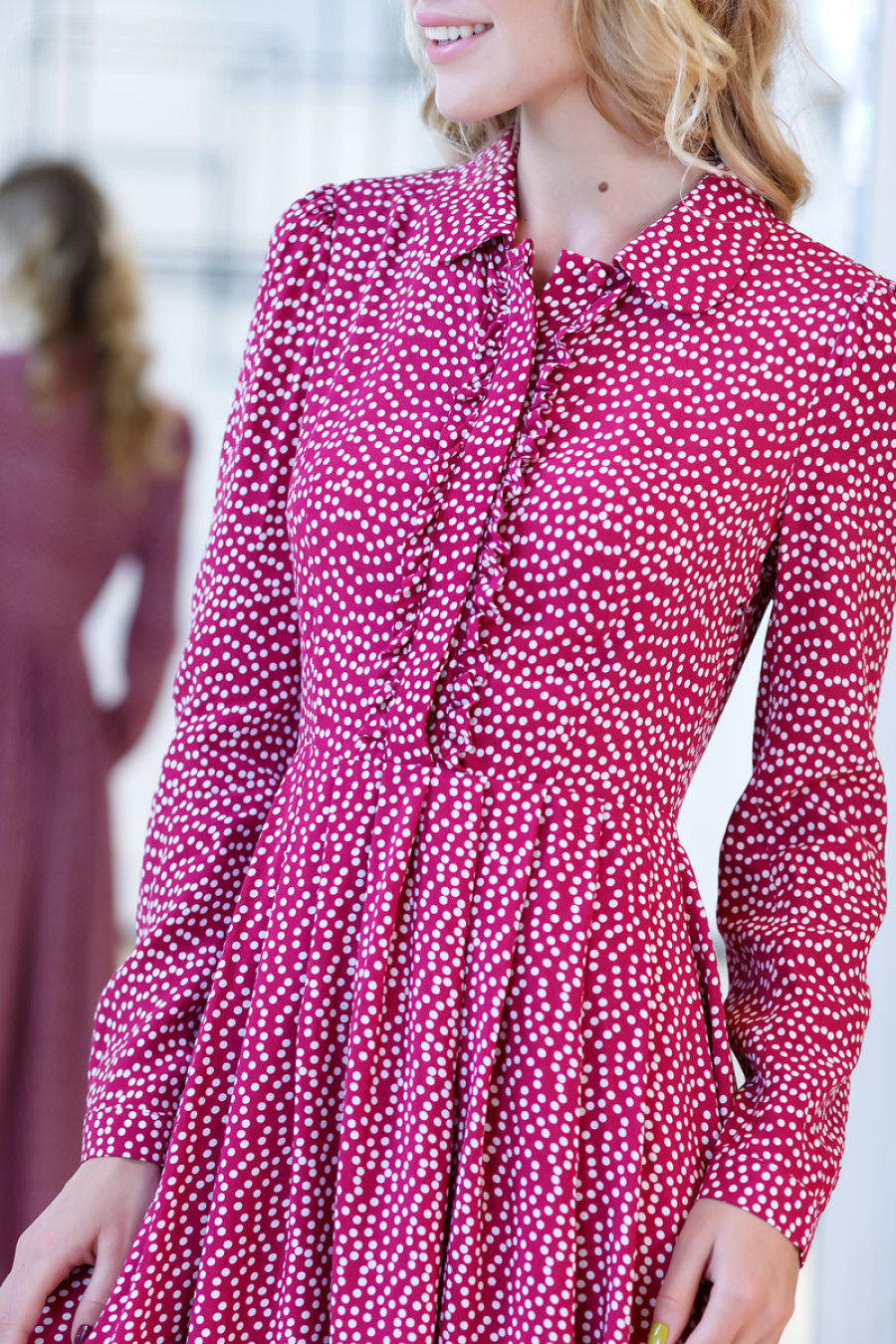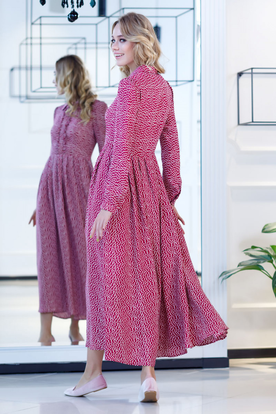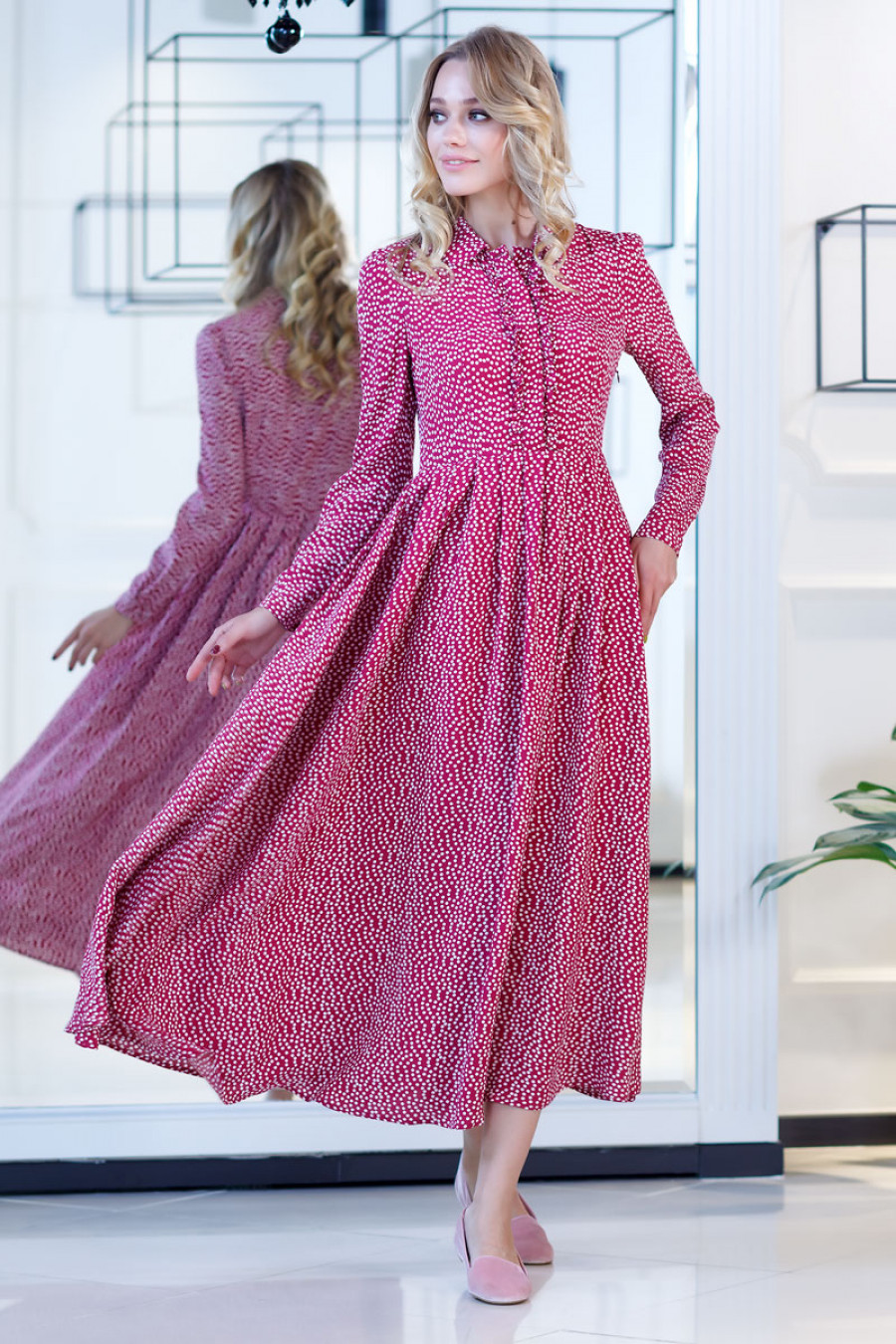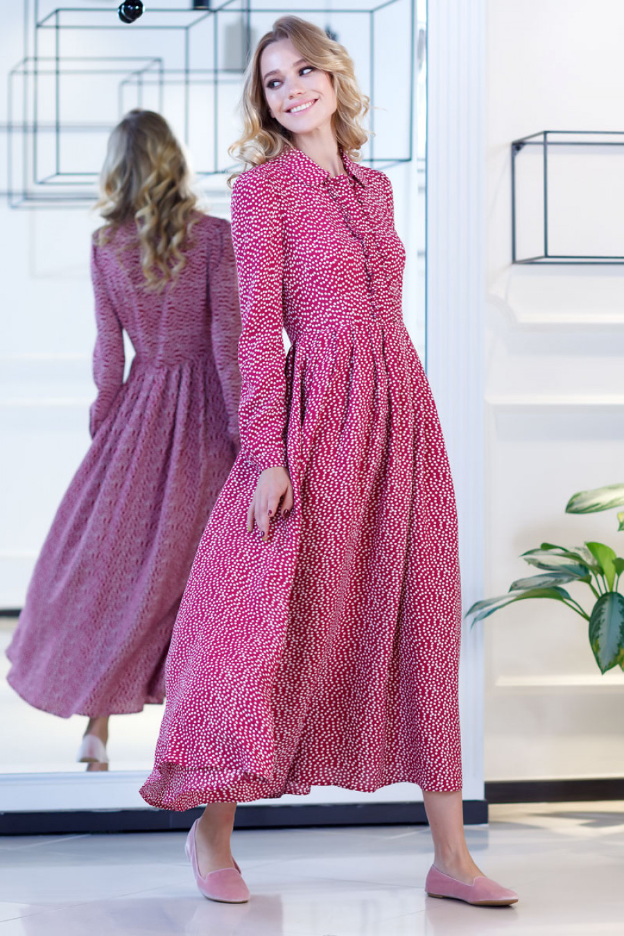 Элегантное платье макси из легкого штапеля с хаотичным принтом в горошек. Модель приталенного силуэта с юбкой в складку. Рукав длинный с манжетой. Горловина оформлена небольшим отложным воротничком. Впереди планка до талии с застежкой на пуговицы.
