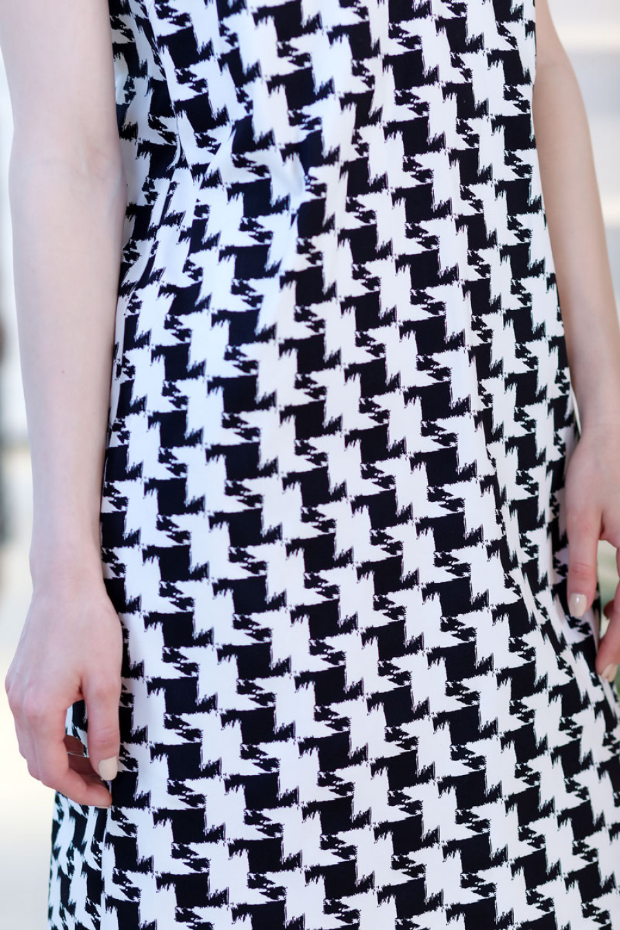 Стильное платье из принтованного хлопка. Модель прямого кроя без рукавов. В боковых швах выполнены карманы. Сзади застежка на потайную молнию.