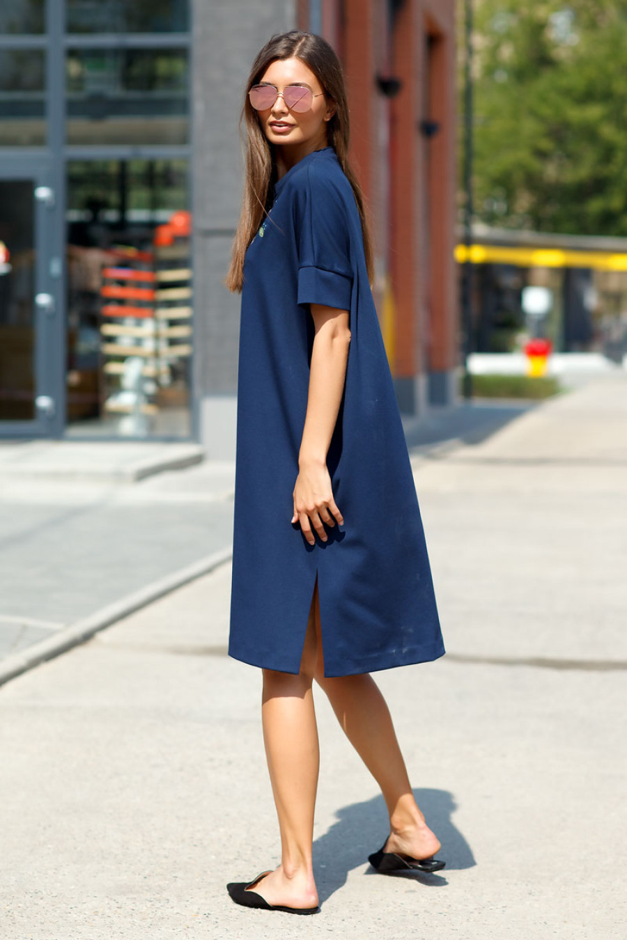 Стильное платье миди из плотного джерси. Модель оверсайз прямого кроя с коротким рукавом и округлым вырезом горловины. По бокам выполнены разрезы. Платье декорировано вышивкой по полочке.