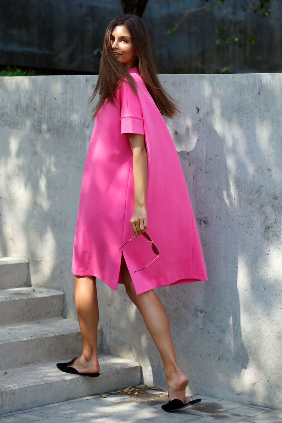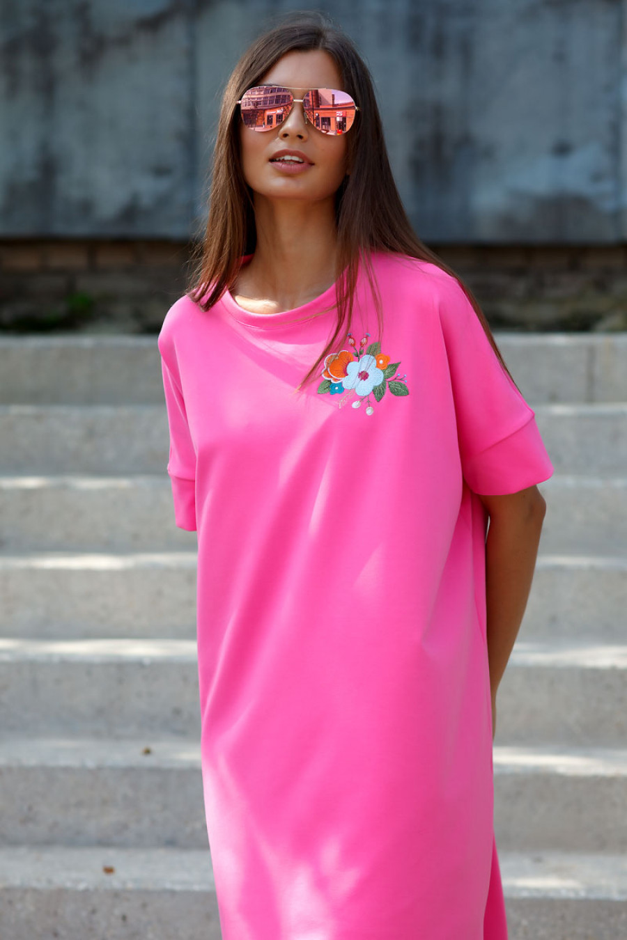 Стильное платье миди из плотного джерси. Модель оверсайз прямого кроя с коротким рукавом и округлым вырезом горловины. По бокам выполнены разрезы. Платье декорировано вышивкой по полочке.