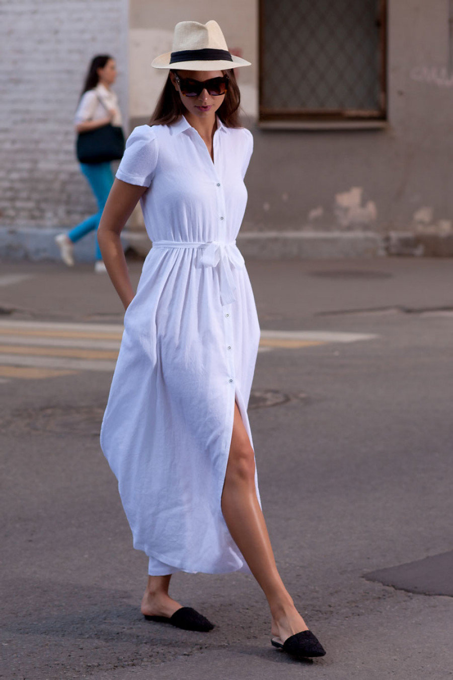 Элегантное платье макси из легкого хлопка на подкладке. Модель приталенного силуэта с коротким рукавом. Горловина оформлена аккуратным воротничком. Впереди застежка на планку с пуговицами. В боковых швах выполнены карманы.