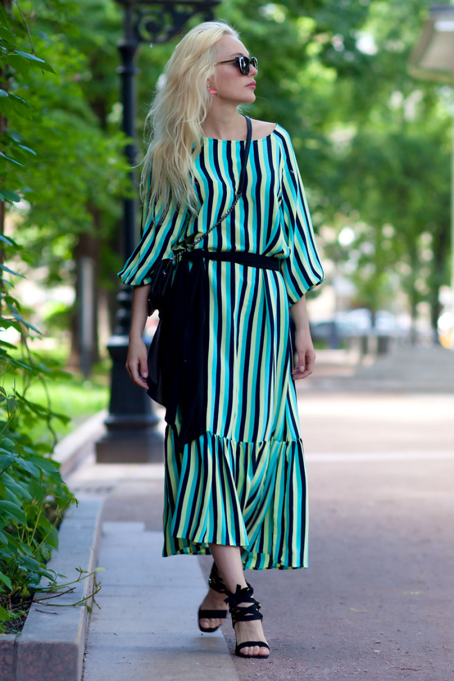 Эффектное летнее платье макси из ткани с ярким принтом в полоску. Модель свободного кроя с вырезом горловины лодочка. Рукав собран по низу на резинку. По низу платье декорировано широким воланом.