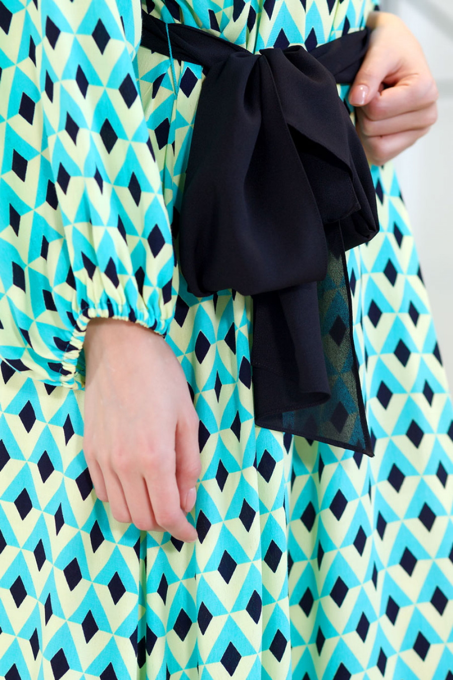 Эффектное летнее платье макси из ткани с ярким принтом. Модель свободного кроя с вырезом горловины лодочка. Рукав собран по низу на резинку. По низу платье декорировано широким воланом.