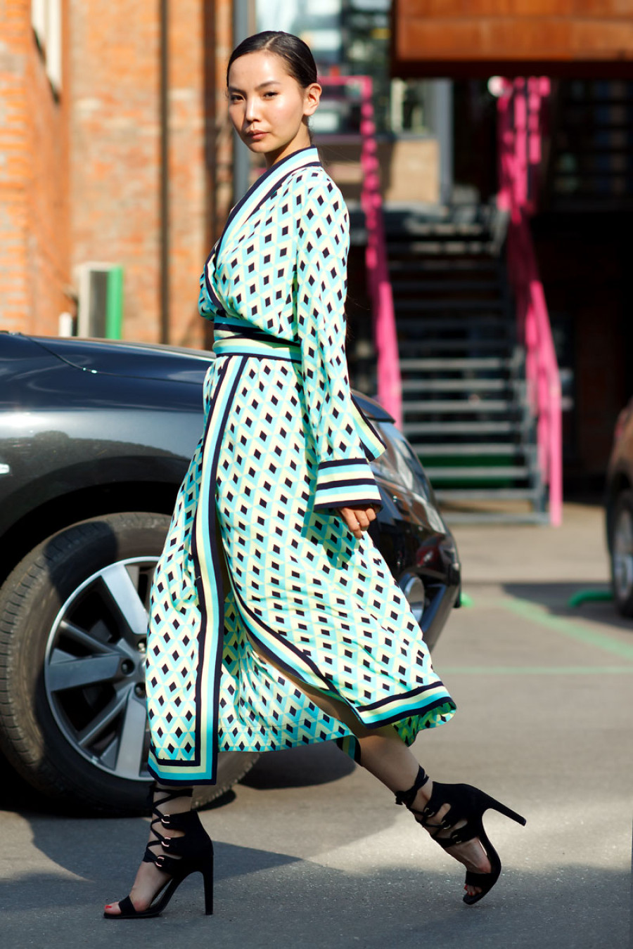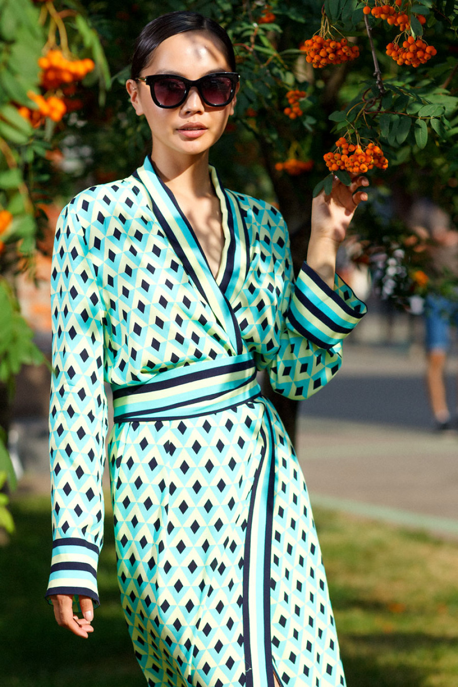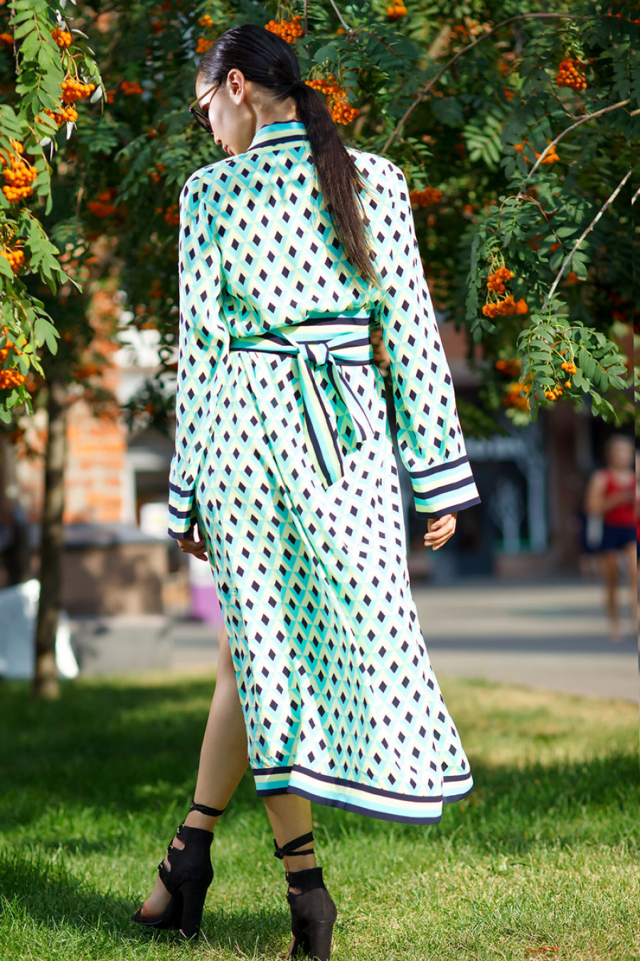 Эффектное платье-халат из приятной креповой ткани. Модель прямого силуэта с длинным рукавом. Ярким акцентом служит отделка по низу и борту из ткани в полоску. На талии завязывается пояс.