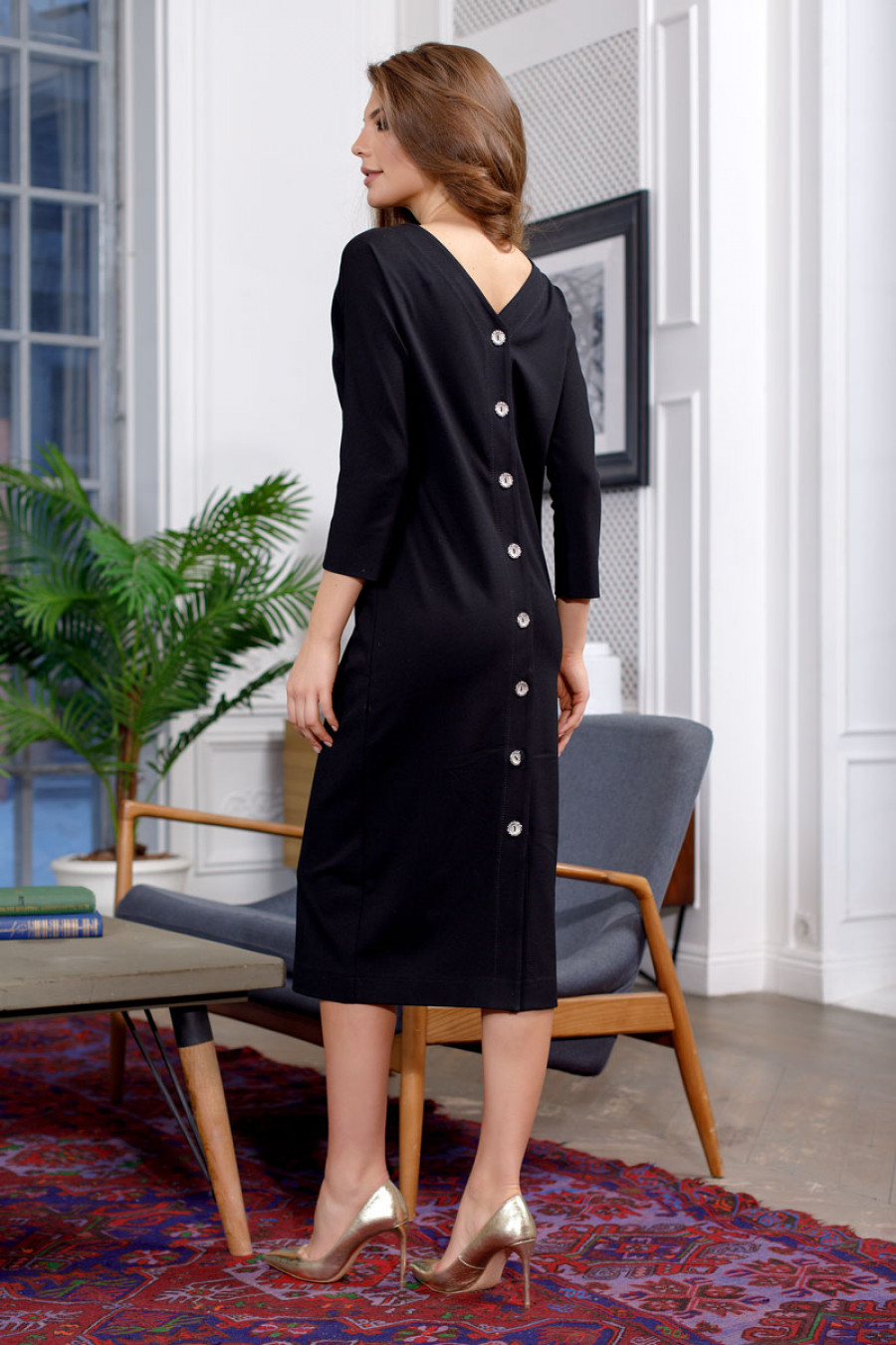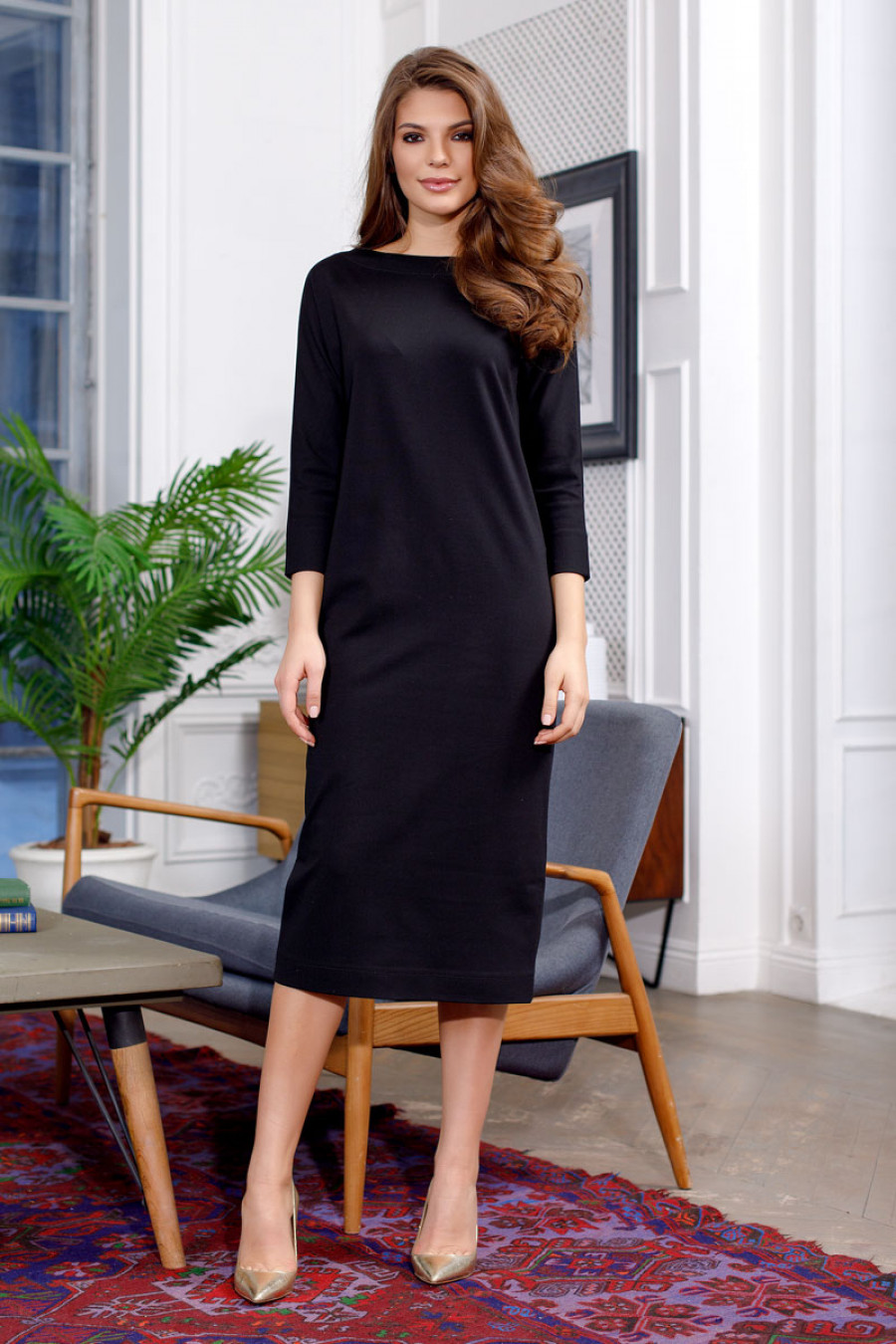 Элегантное платье-футляр из джерси. Модель полуприлегающего силуэта длины миди. Рукав 7/8 покроя "летучая мышь". Сзади застежка на пуговицы. На талии завязывается пояс.