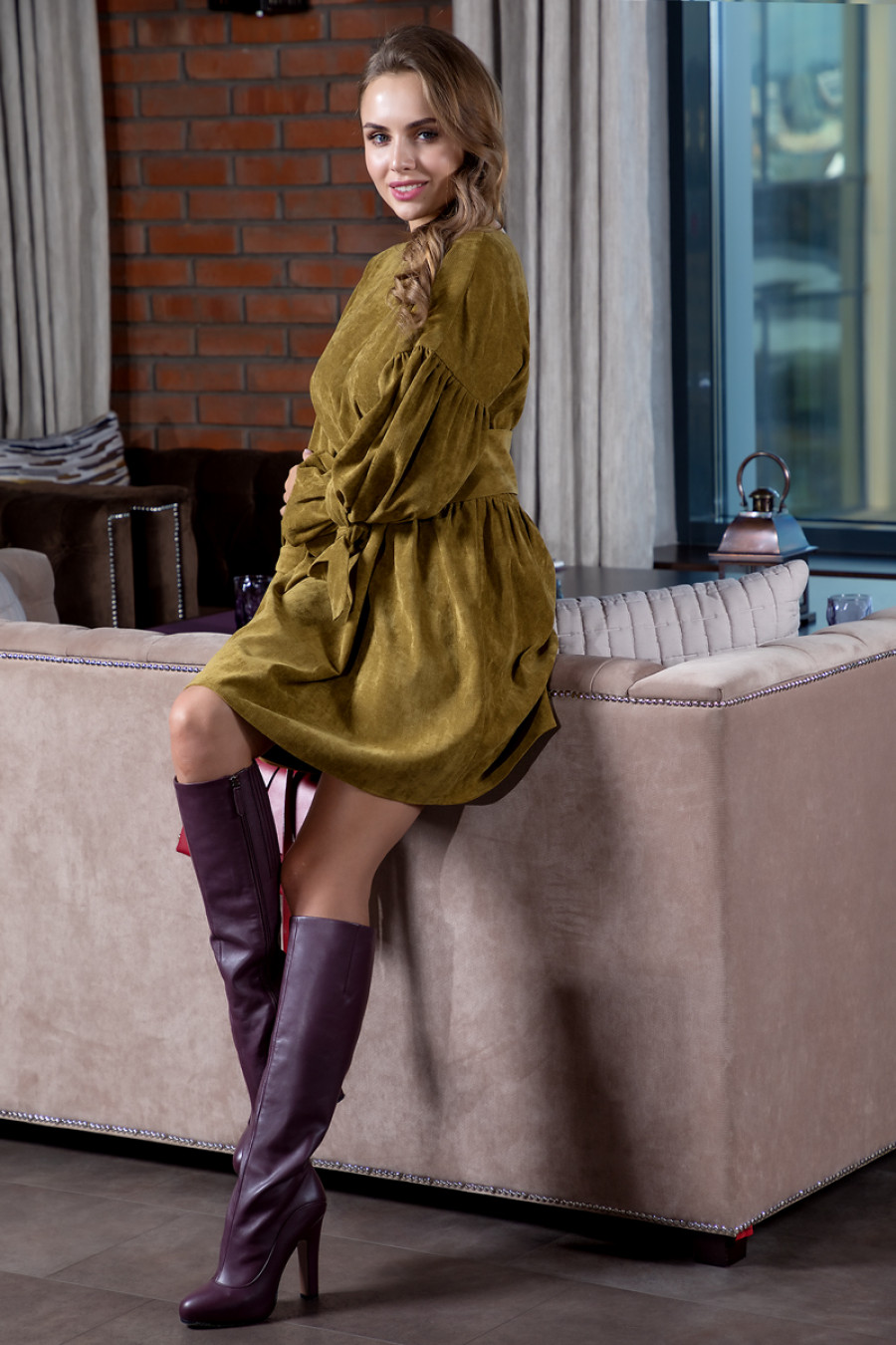 Эффектное платье из приятного вельвета нежных оттенков. Модель свободного кроя с длинным рукавом. По низу рукава собраны в складки и подвязаны лентами из ткани платья. По талии навесной пояс с декоративным кольцом, застегивается на пуговицы.