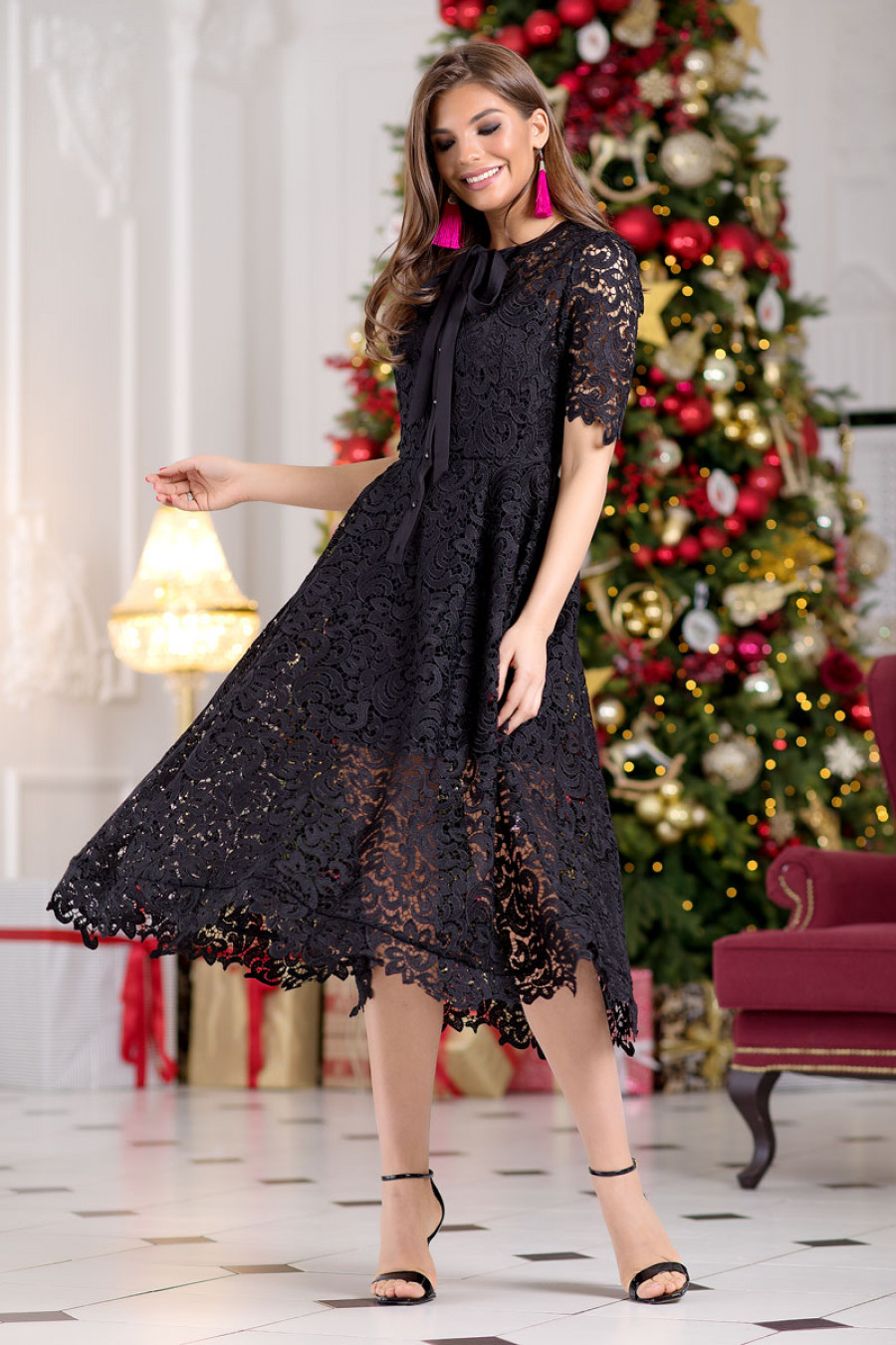 Внимание! Комбинация под платье продается отдельно! Доступна в трех цветах черный, беж,розовый арт.0123241 Нарядное кружевное платье миди из шикарного гипюра. Модель приталенного силуэта с юбкой в складку и коротким рукавом. Горловина оформлена обтачкой,завязывающейся в бант. Впереди планка чуть ниже талии с застежкой на пуговицы.
