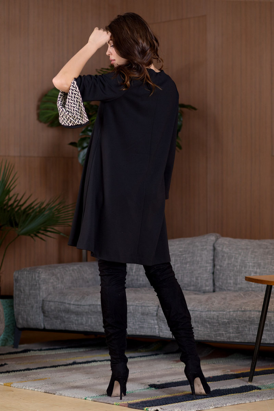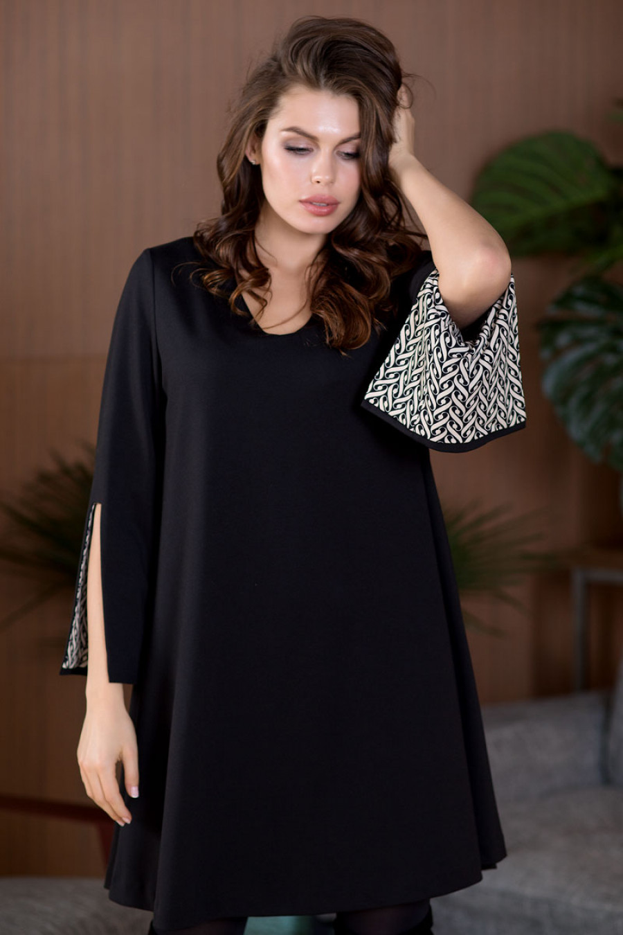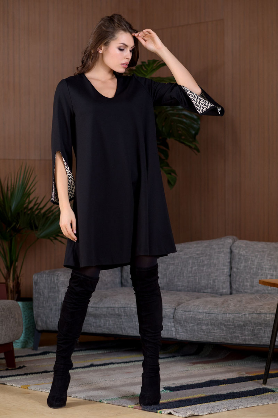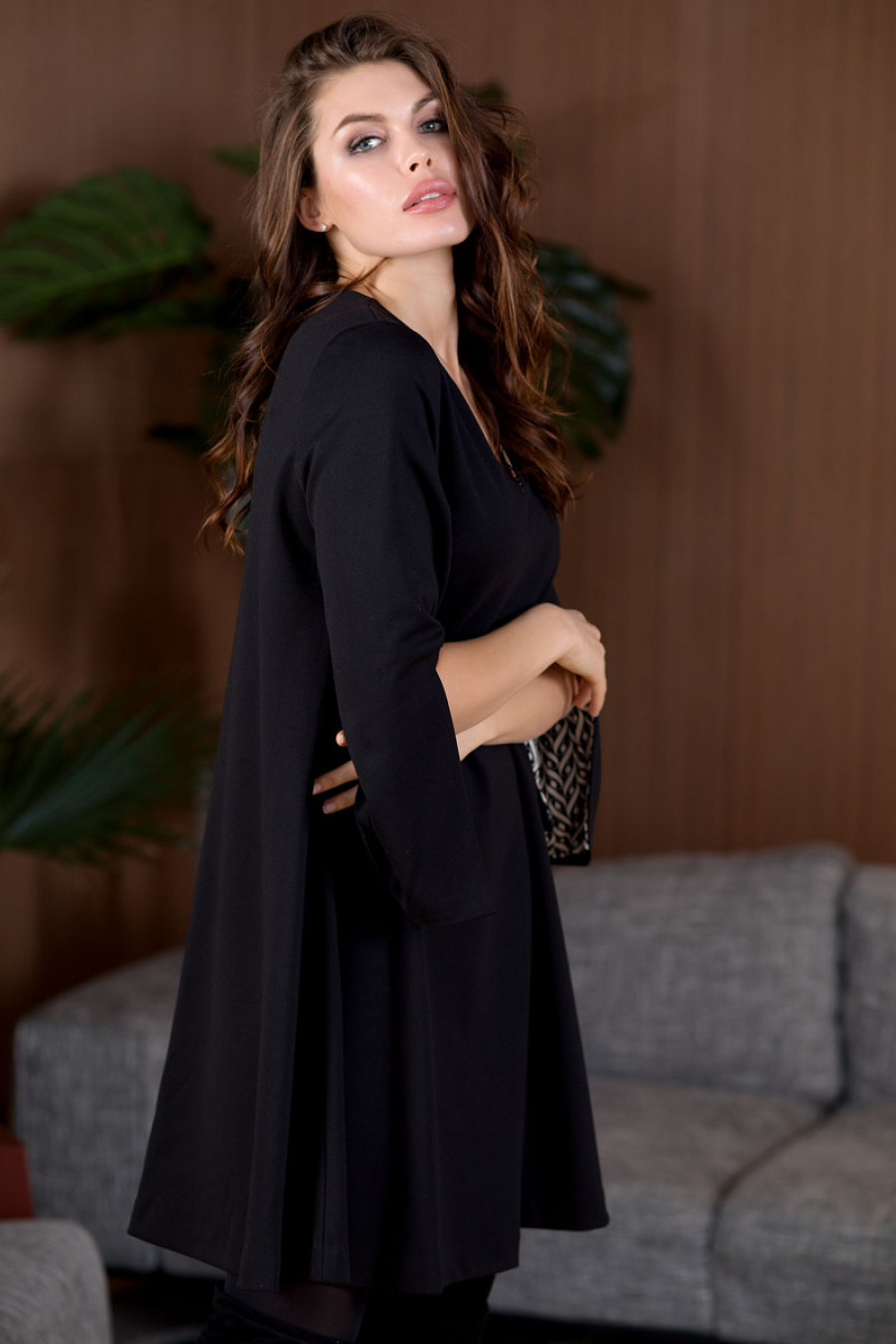 Элегантное платье из однотонного джерси. Модель свободного кроя с глубоким v-образным вырезом. Рукав длинный спереди с разрезом до локтя.