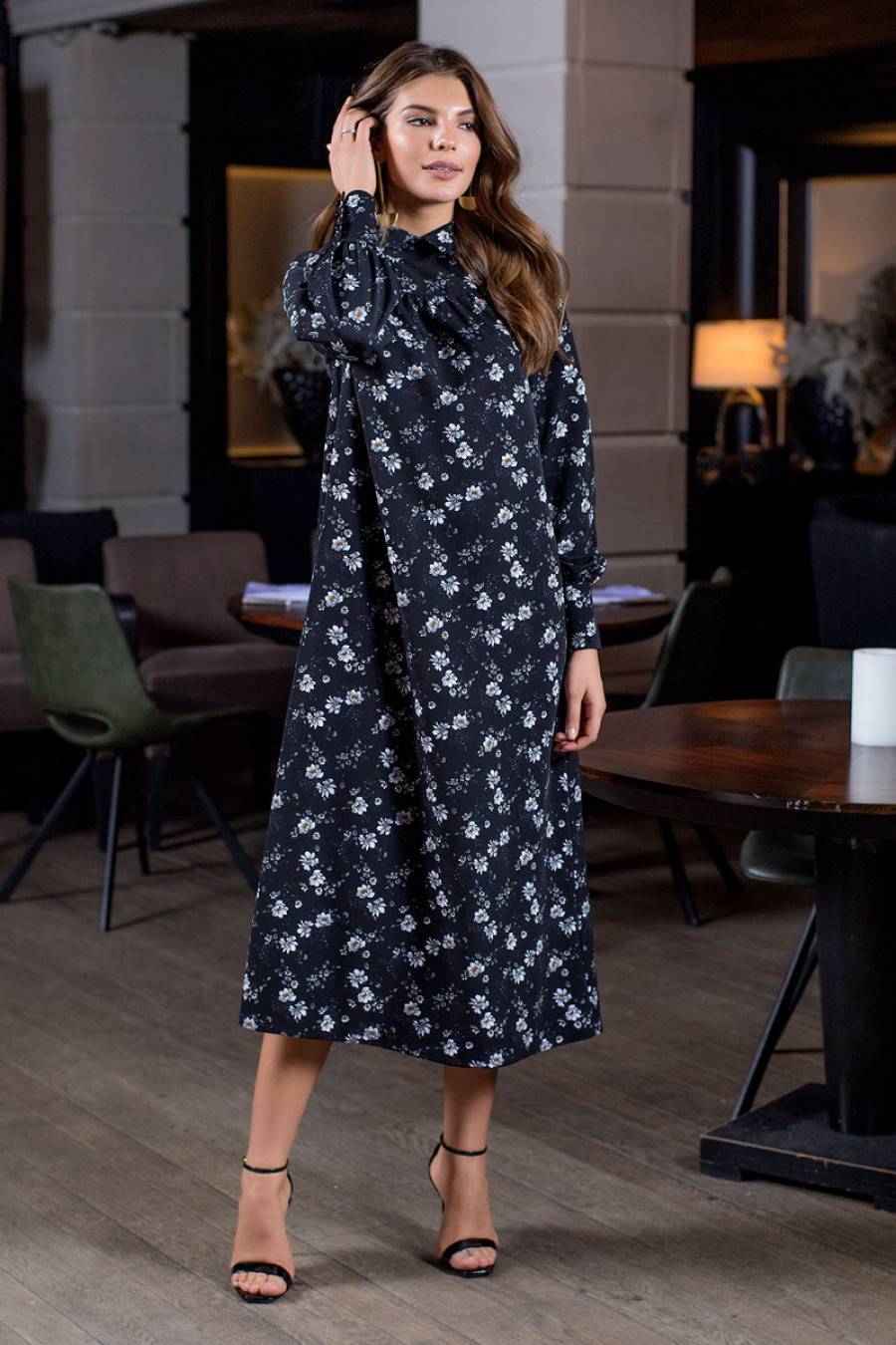 Элегантное платье миди из плательной ткани с цветочным принтом. Модель свободного кроя на кокетке и с небольшим воротником. Рукава длинные с широкими манжетами на пуговицах. Сзади застежка на потайную молнию. В комплект к платью прилагается шарф и пояс.