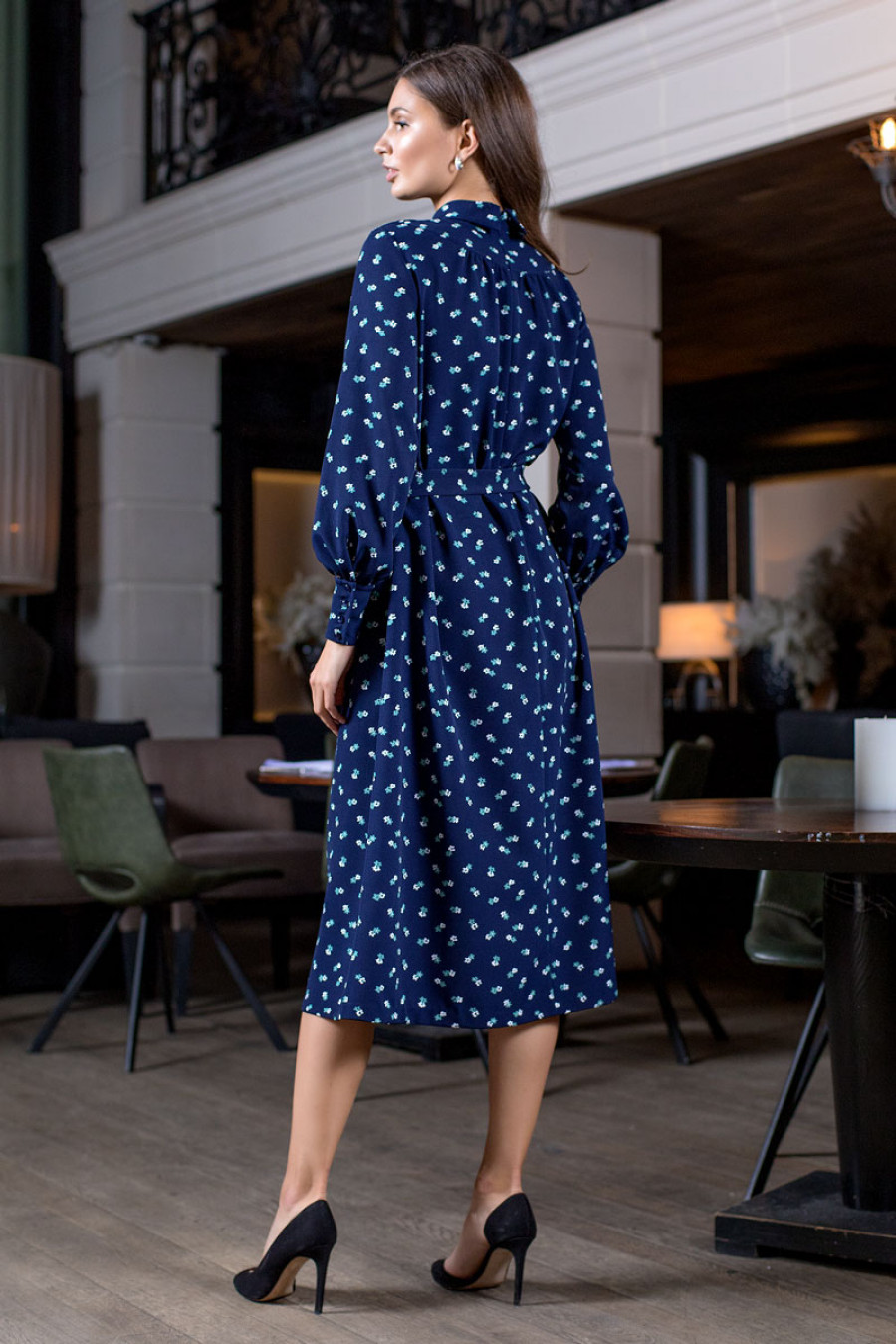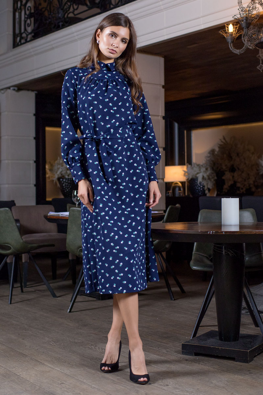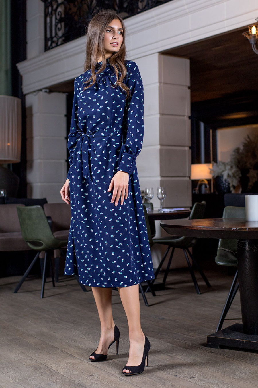 Элегантное платье миди из плательной ткани с цветочным принтом. Модель свободного кроя на кокетке и с небольшим воротником. Рукава длинные с широкими манжетами на пуговицах. Сзади застежка на потайную молнию. В комплект к платью прилагается шарф и пояс.