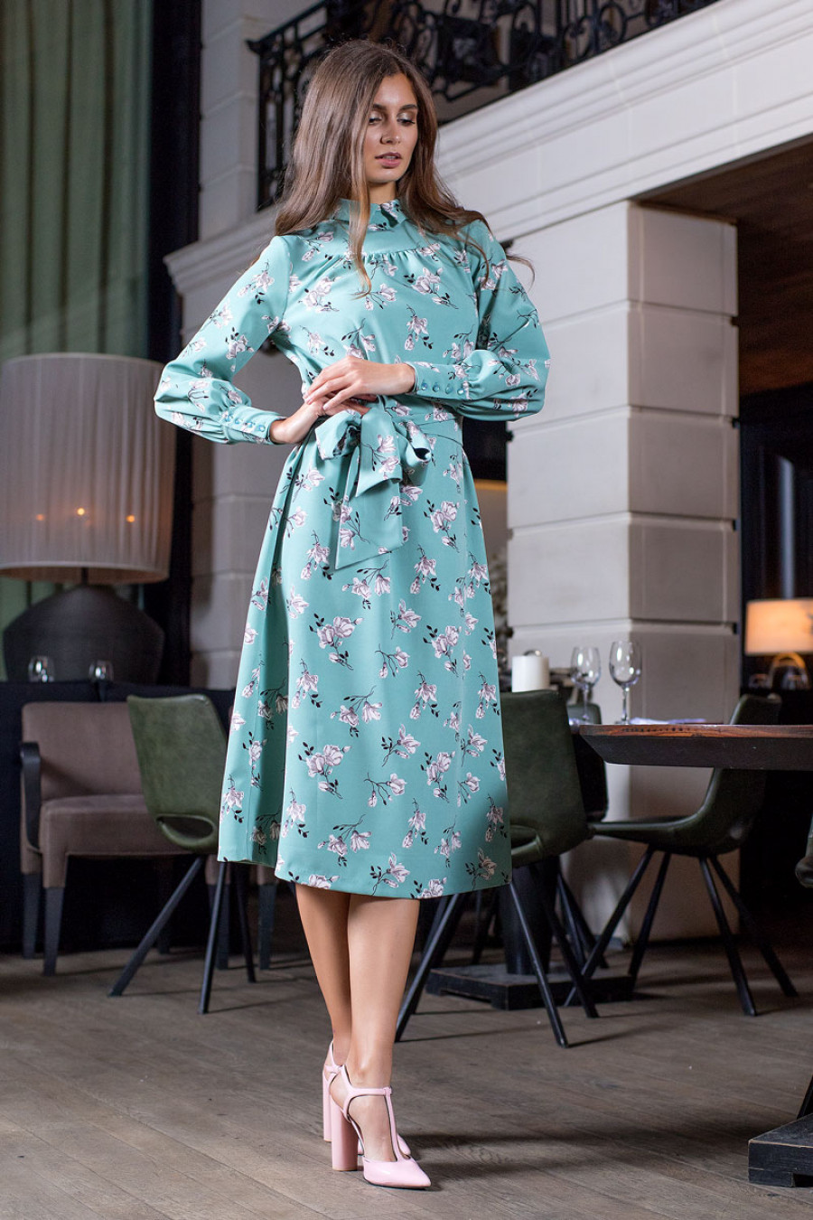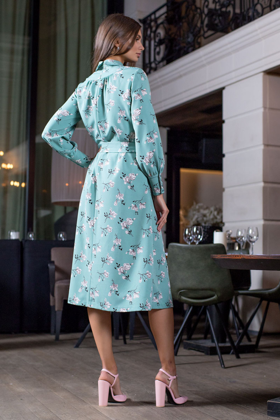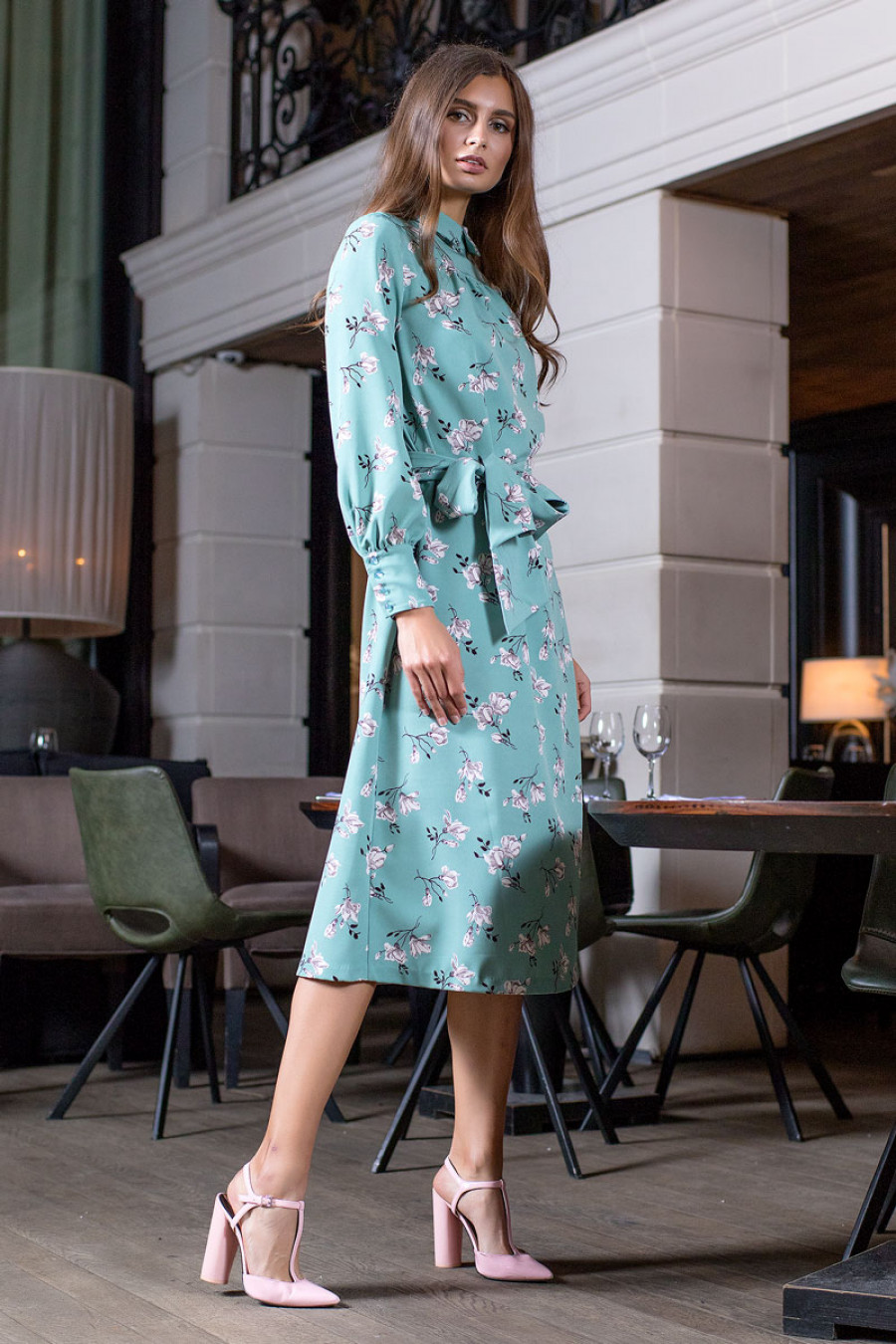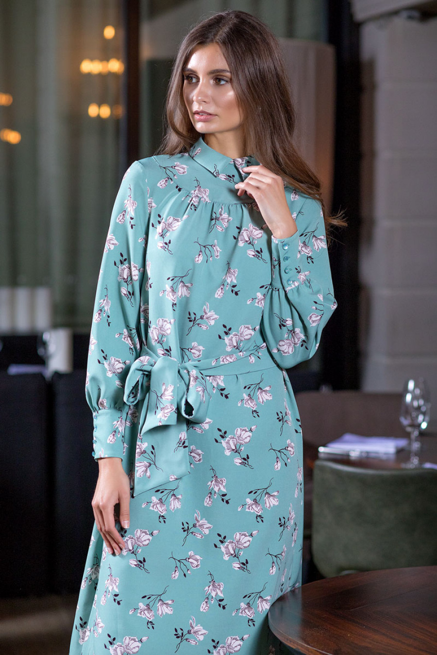Элегантное платье миди из плательной ткани с цветочным принтом. Модель свободного кроя на кокетке и с небольшим воротником. Рукава длинные с широкими манжетами на пуговицах. Сзади застежка на потайную молнию. В комплект к платью прилагается шарф и пояс.