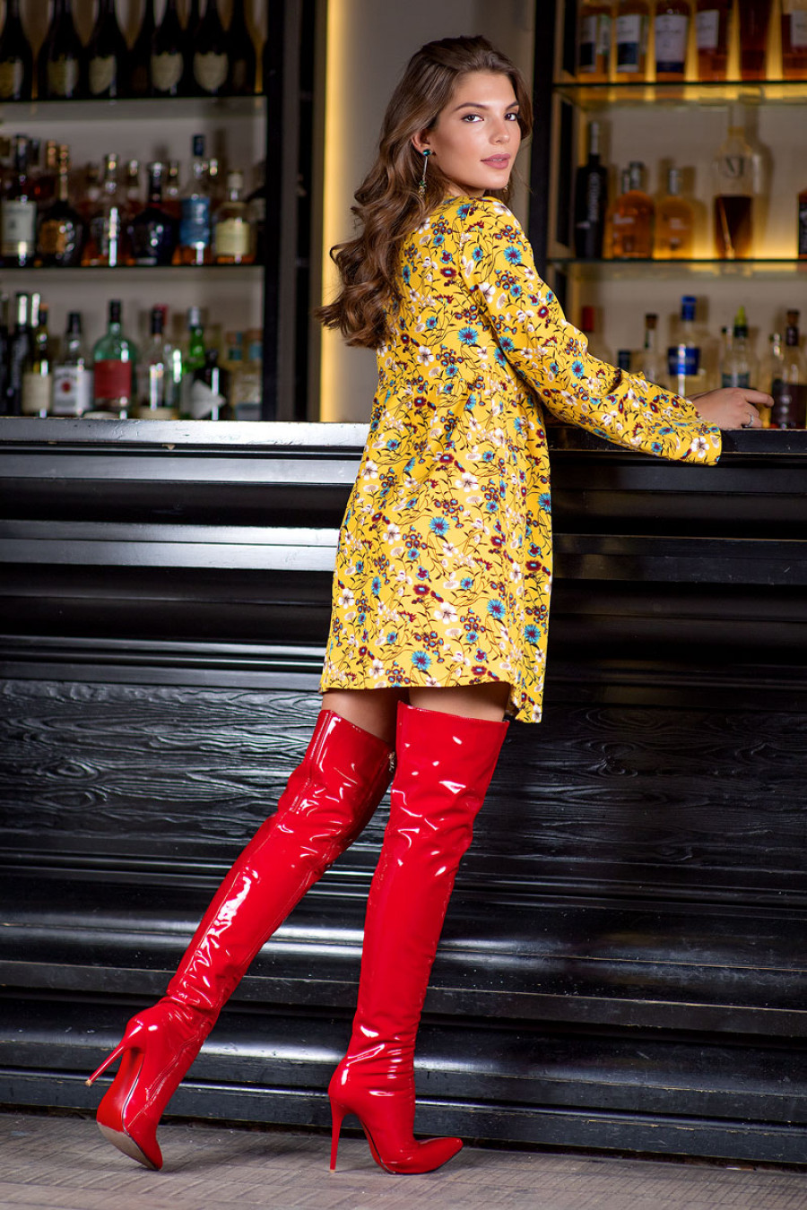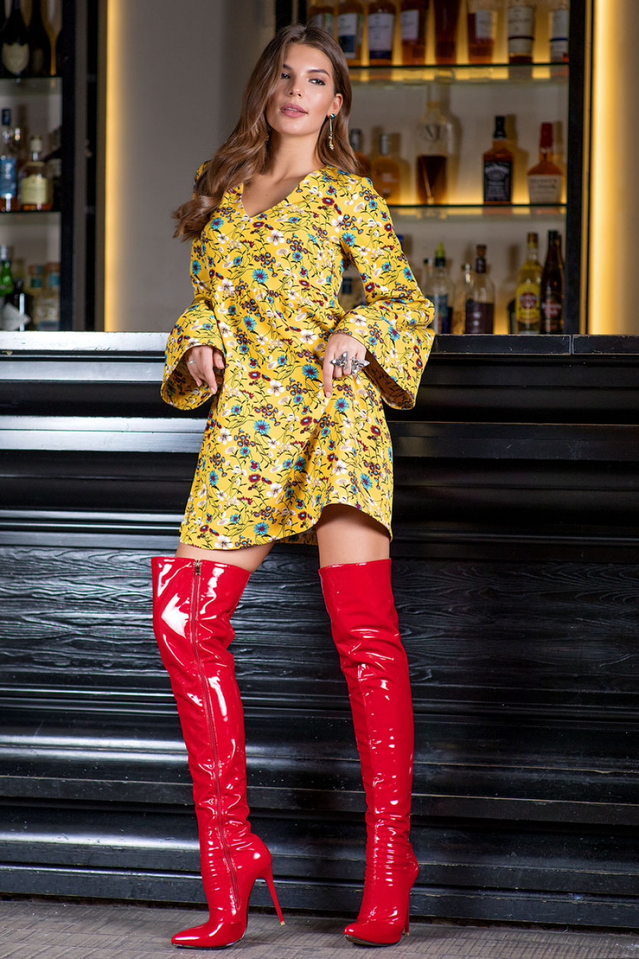 Стильное платье мини из ткани с цветочным принтом. Модель отрезная по линии талии с юбкой клеш. Рукав втачной, расклешенный к низу, с отделочными строчками по манжете. Сзади застежка на потайную молнию.