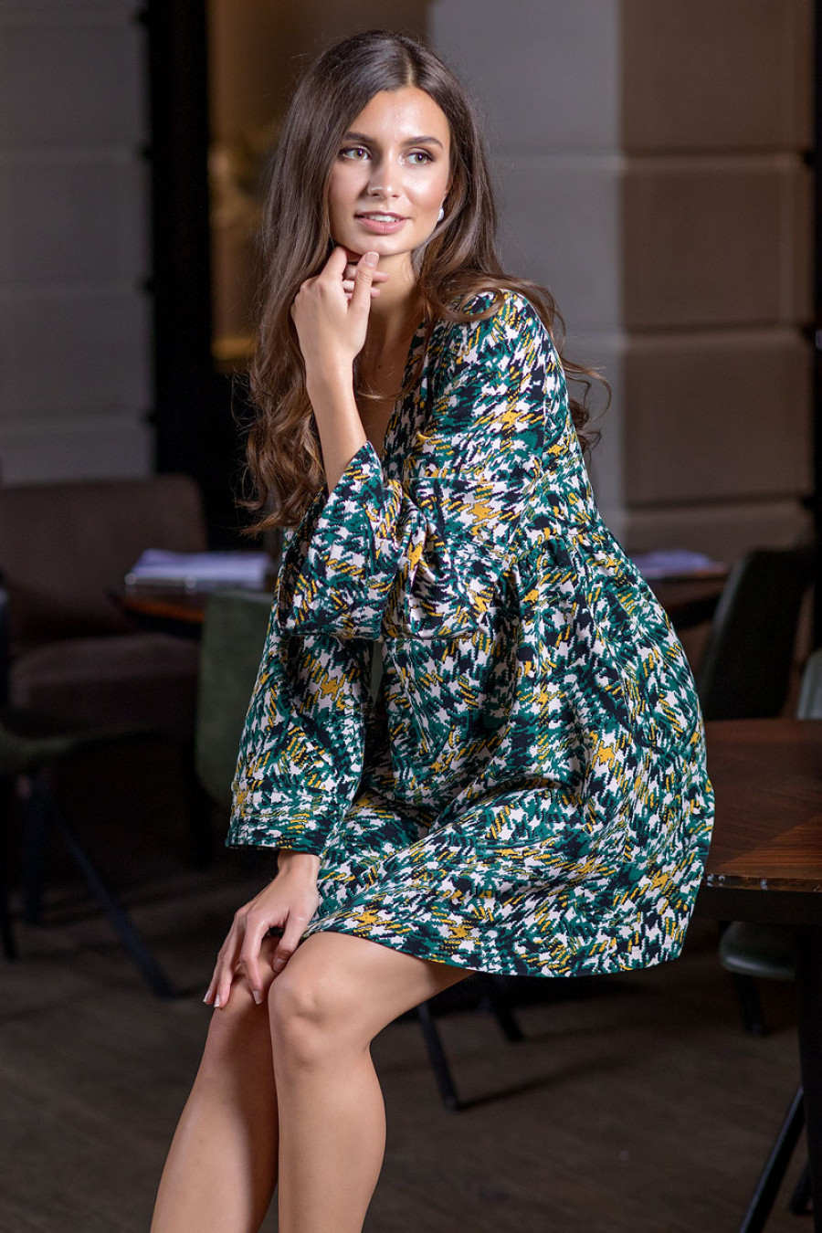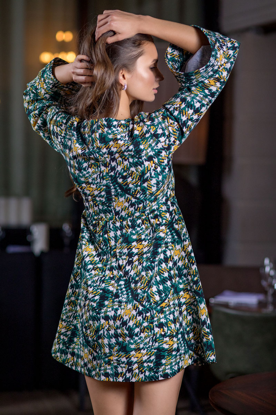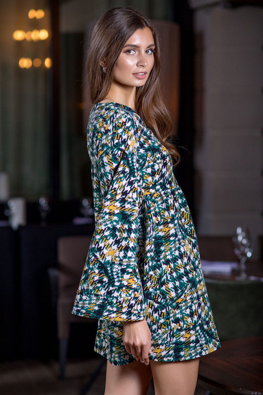 Стильное платье мини из ткани с цветочным принтом. Модель отрезная по линии талии с юбкой клеш. Рукав втачной, расклешенный к низу, с отделочными строчками по манжете. Сзади застежка на потайную молнию.