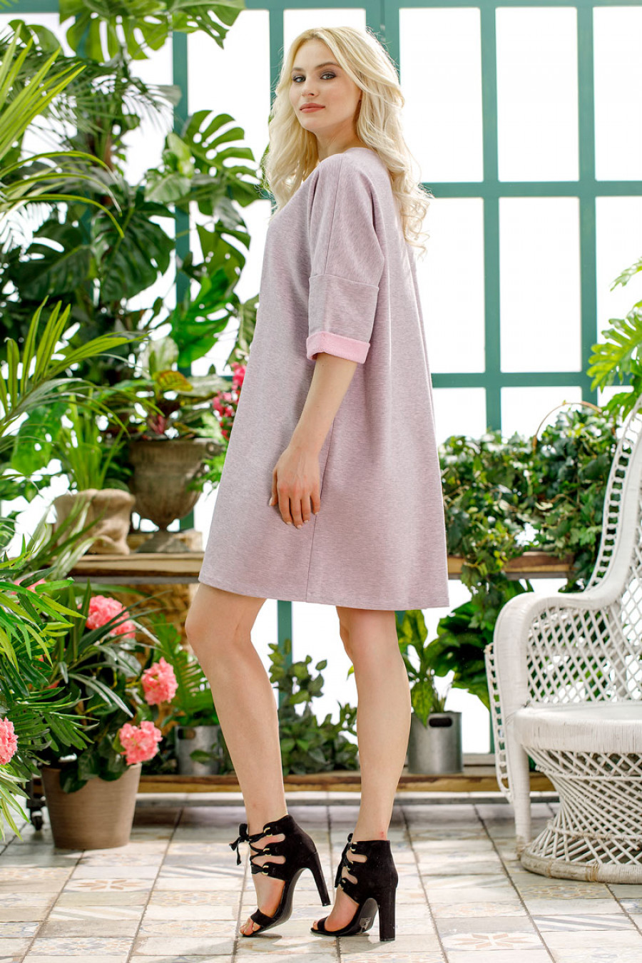 Объемное спортивное платье из плотного футера. Модель свободного кроя с круглой горловиной и рукавом до локтя. На полочке декоративные петли со шнуровкой из атласной ленты.