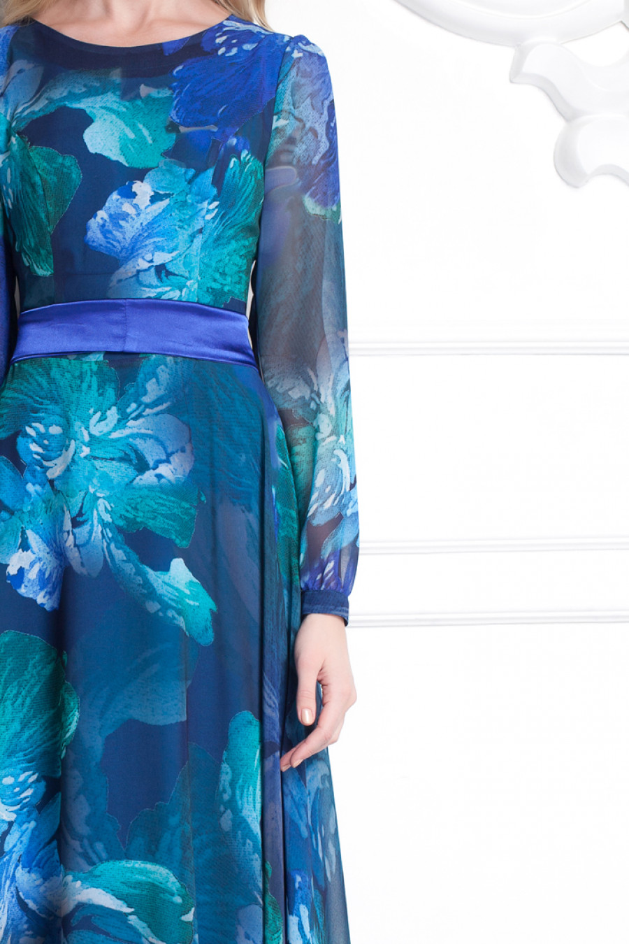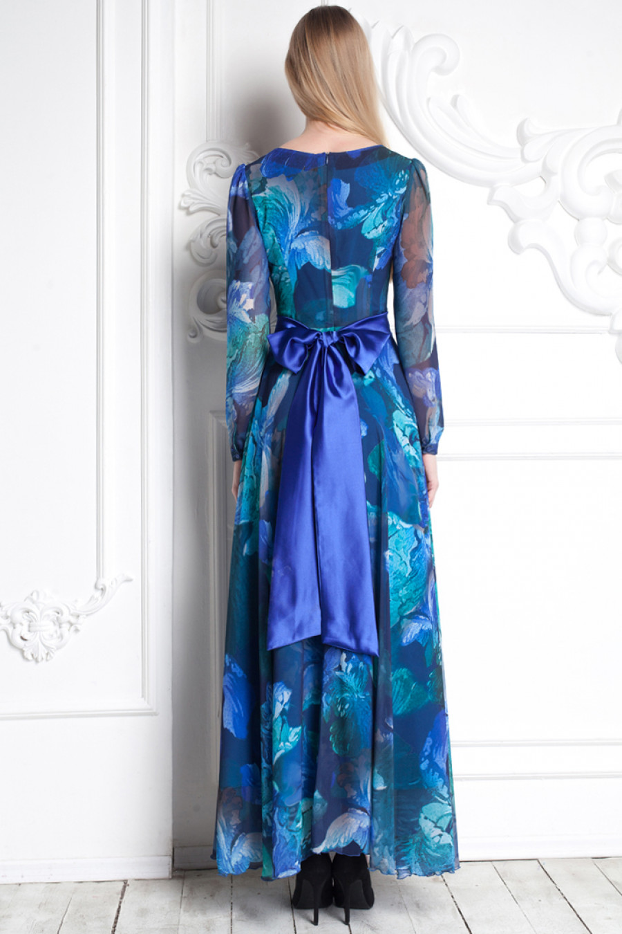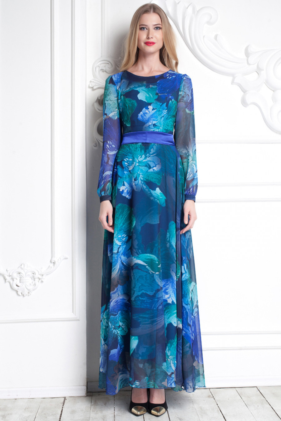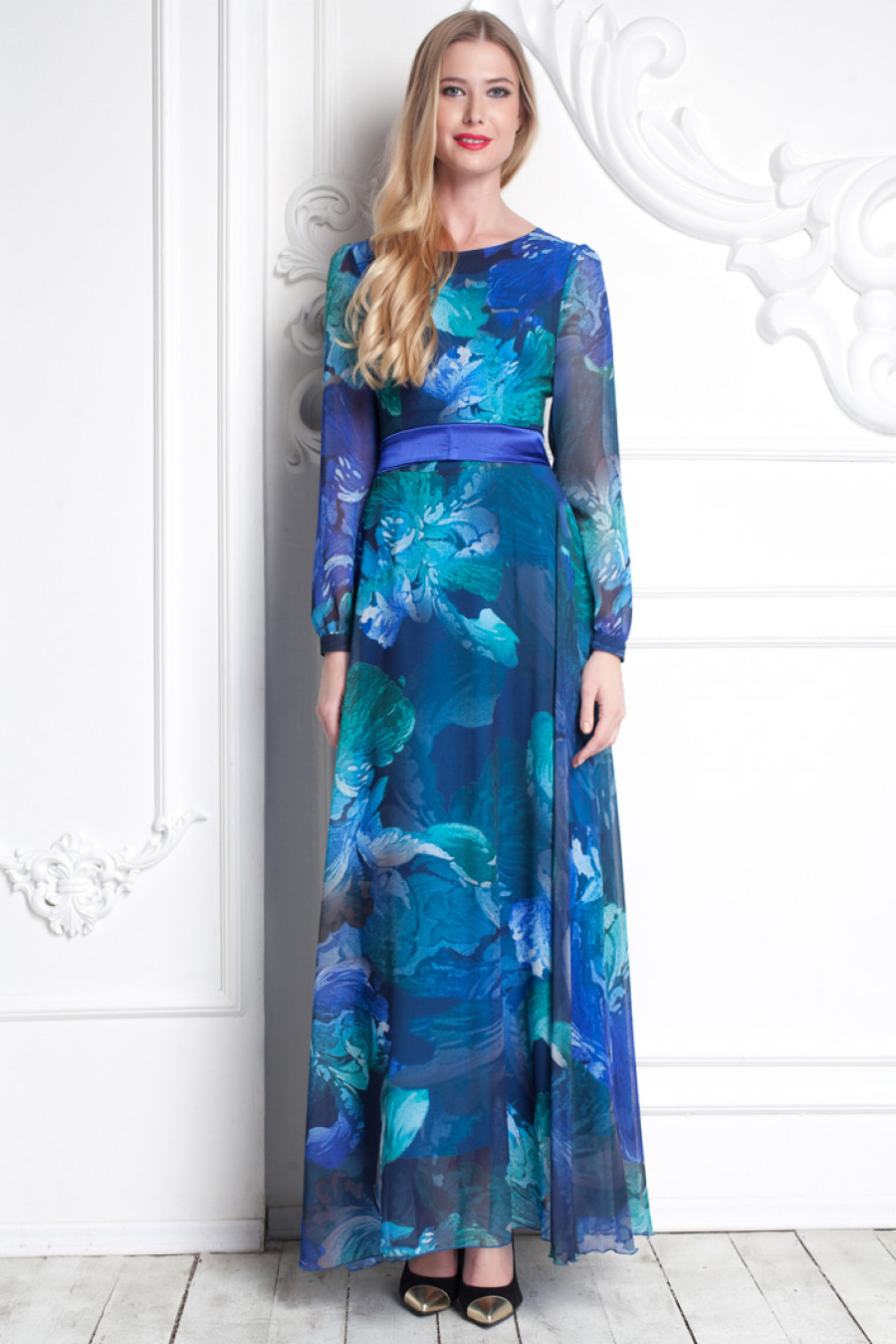 Само воплощение нежности и утонченности. Платье в пол с расклешенной юбкой. Модель данного платья имеет отличительную особенность - материал из струящегося шифона. Шифон с крупным цветочным принтом создаёт особо романтичный образ. Платье с длинным рукавом и высоким овальным вырезом. Обратите внимание на элегантный атласный поясок, который замечательно гармонирует с силуэтом данной модели.