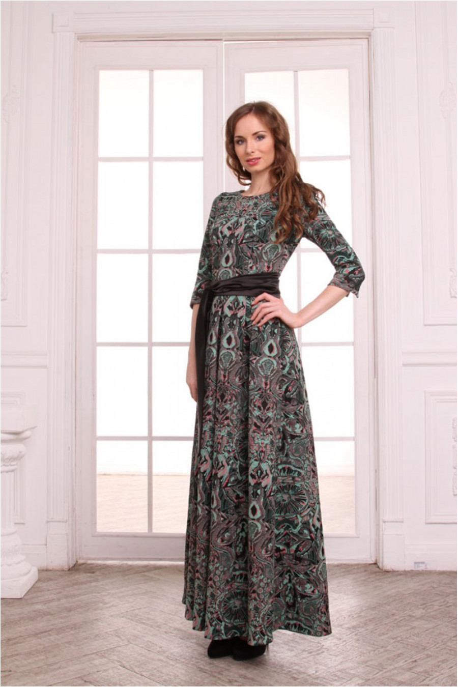 Роскошное, благородное платье в пол из дорогой крупноузорчатой ткани - жаккарда. Платье в пол с расклешенной юбкой. Удлиненный рукав. Основной цвет платья из жаккарда - зеленый. Высокий круглый вырез. По желанию платье можно декорировать широким пояском, чтобы подчеркнуть линию талии.