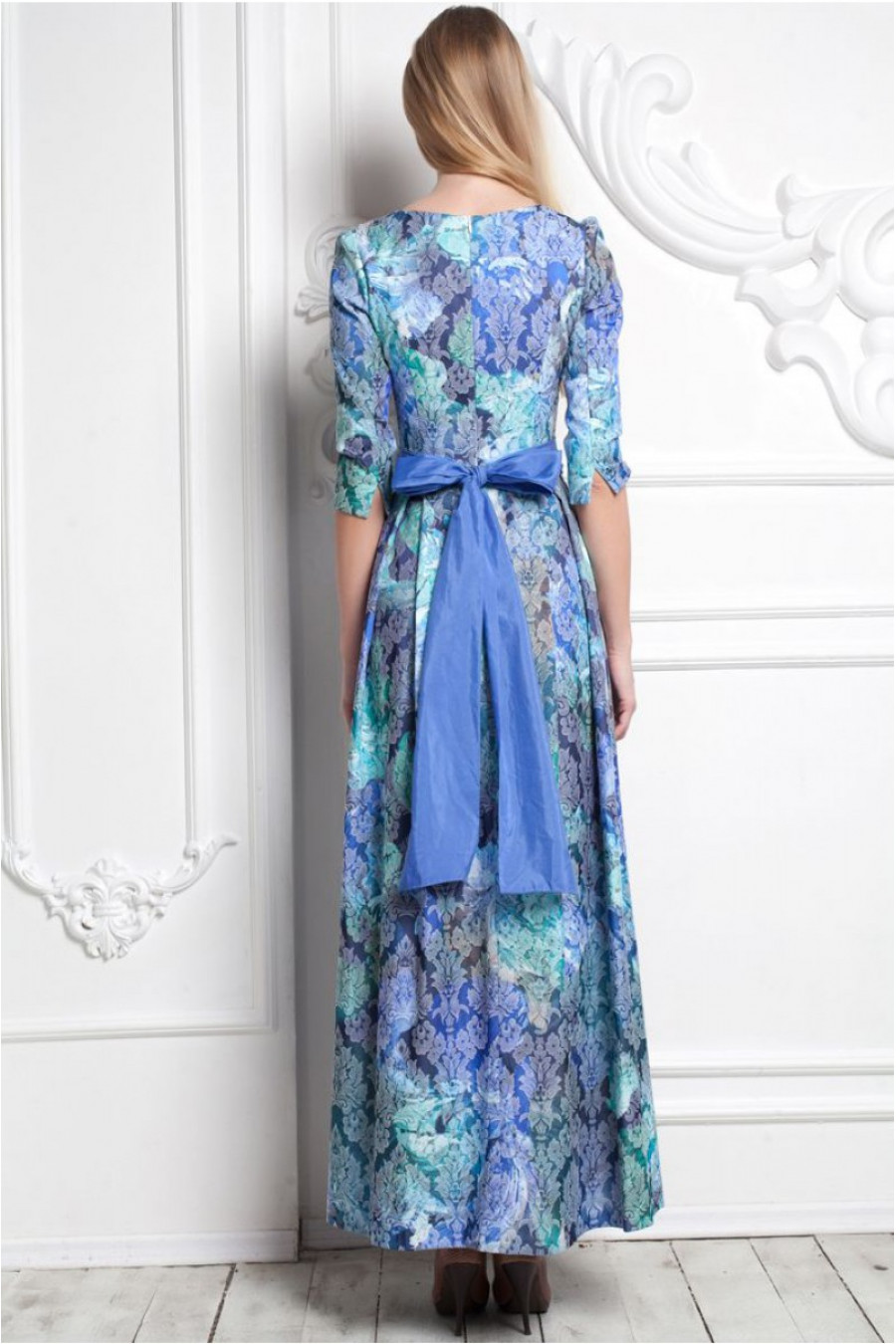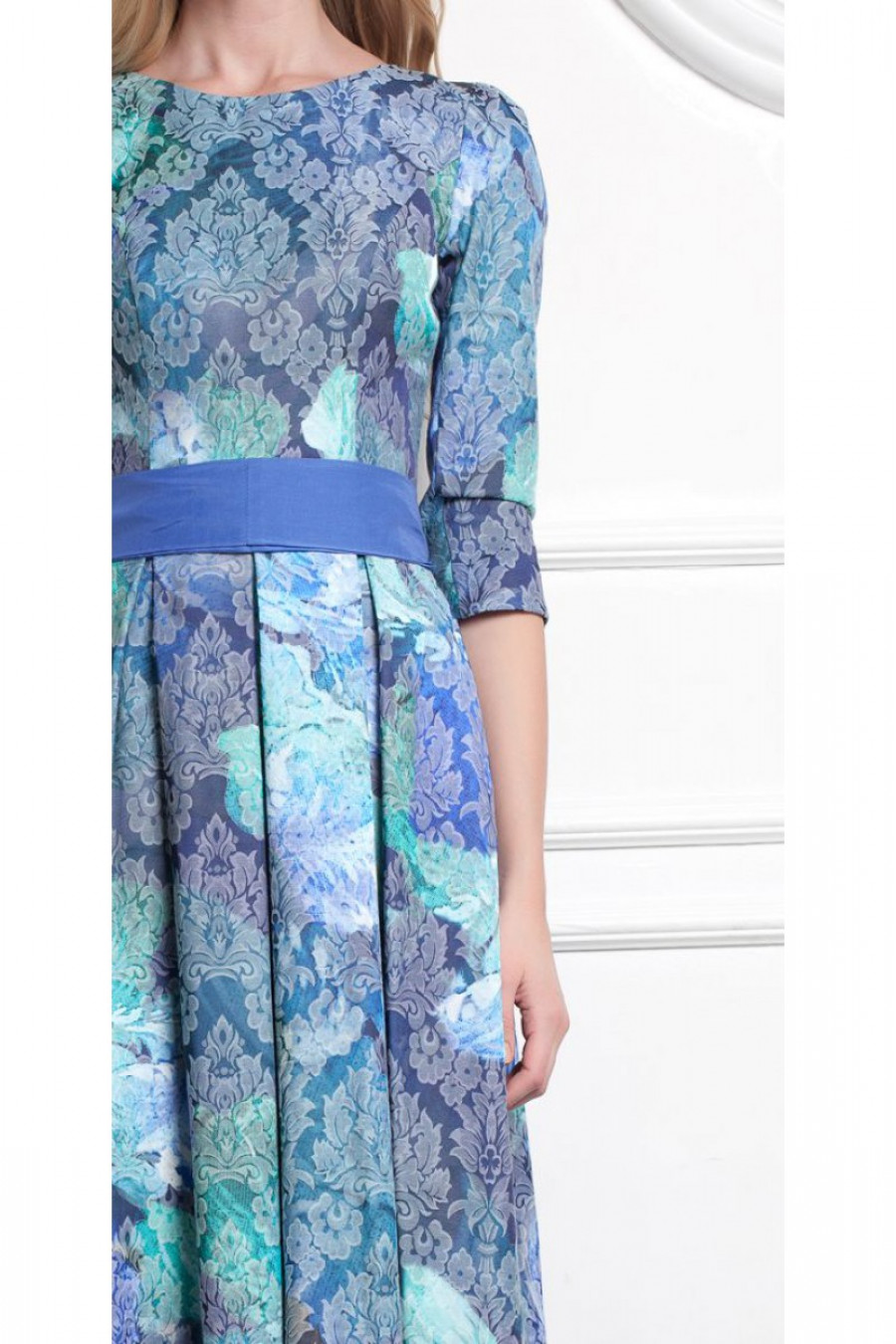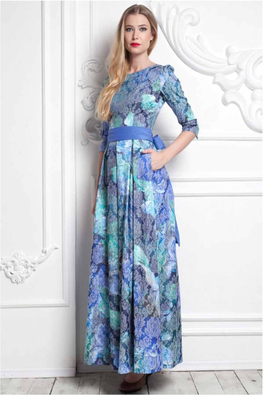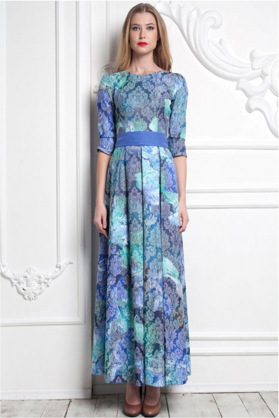 Благородное воплощение нежности и утонченности. Платье в пол с расклешенной юбкой. Модель данного платья имеет рукав - три четверти. Изящность талии подчеркивает тканный пояс в цвет данной модели. Платье с высоким овальным вырезом. Обратите внимание на натуральный состав ткани. Платье из 100% хлопка. Stella Di Mare - это не только мода плюс стиль, но и качество плюс комфорт.
