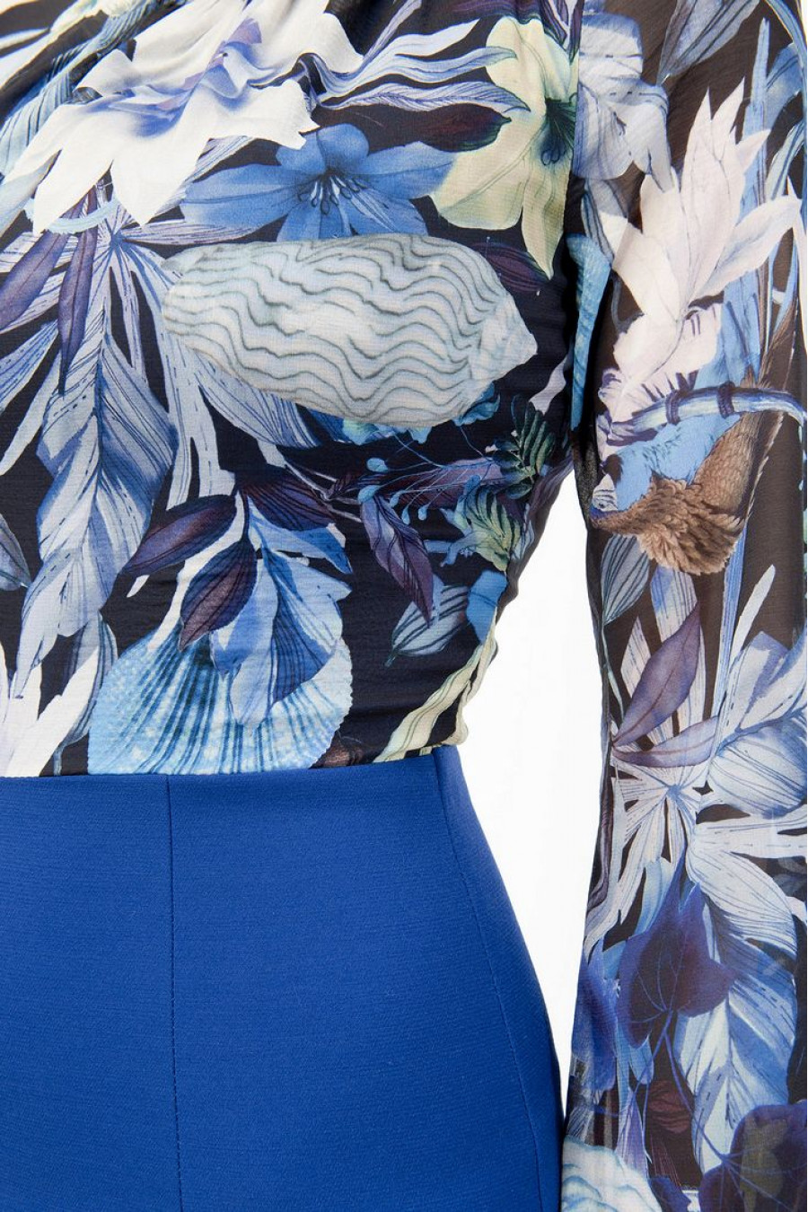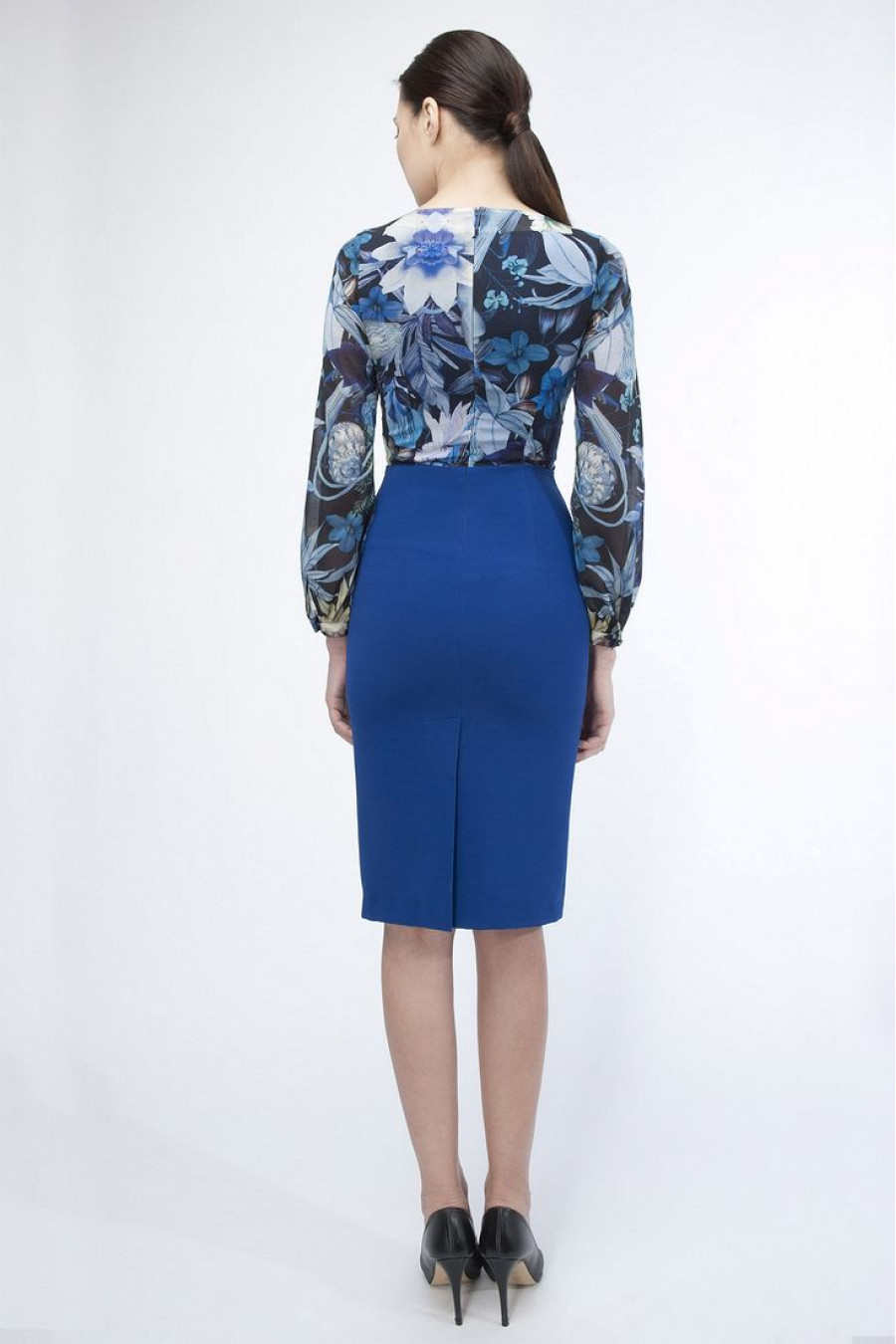 Изящное платье-футляр из новой коллекции с завышенной талией. Эксклюзивная модель платья от Stella Di Mare имеет особую дизайнерскую идею. Отличительной особенностью является необычное сочетание двух тканей. Верх платья оформлен нежнейшим шифоном с расписным цветочным принтом. Низ, более плотный, однотонный. Платье-футляр с длинным рукавом. Высокий овальный вырез. Глубокий голубой колорит. Длина платья ниже колена.