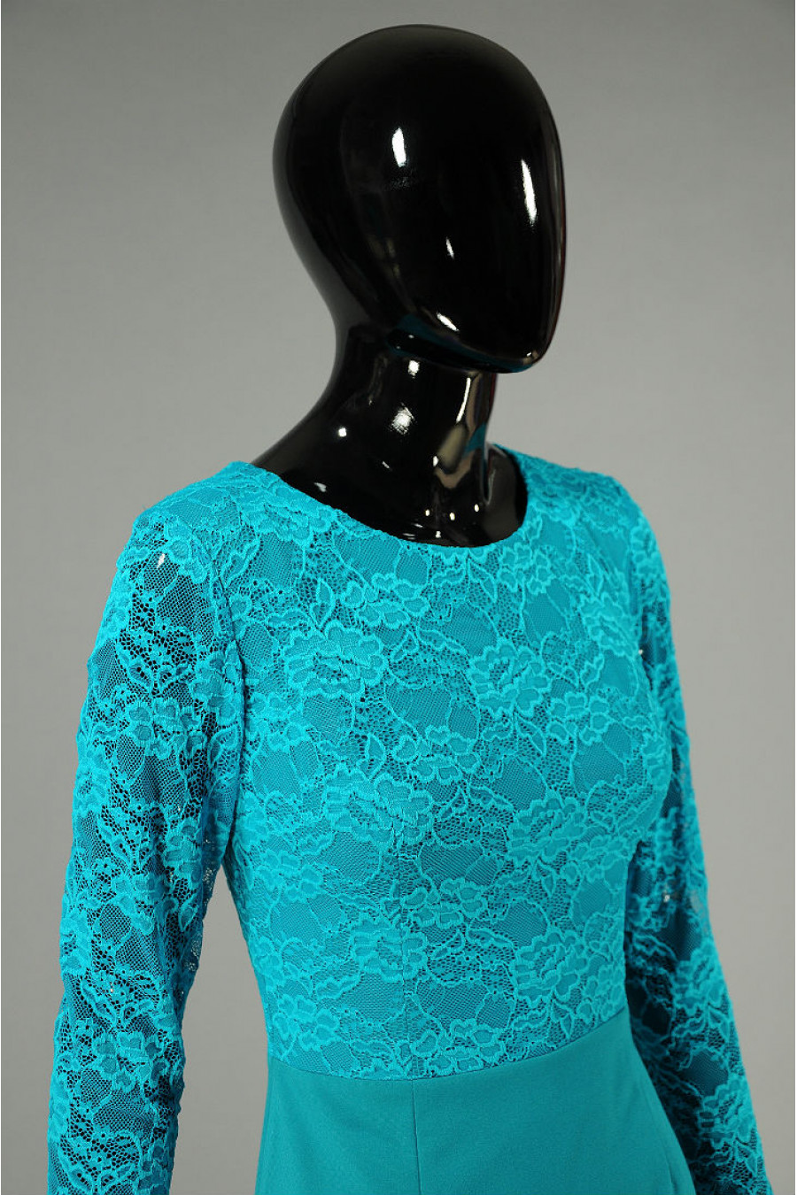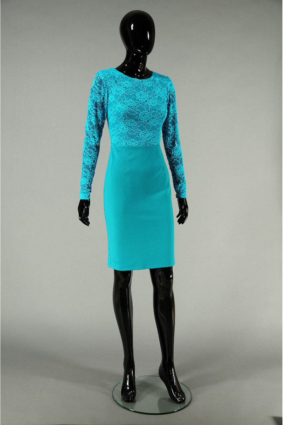 Восхищение и море положительных эмоций. Отличительная черта женственного и романтичного образа - это платье имеющее цветочный принт и гипюр. Данная модель платья-футляр насыщенного бирюзового цвета соответствует всем перечисленным требованиям. Верх платья и длинный рукав оформлен кружевным цветочным гипюром. Модель чуть выше колена.