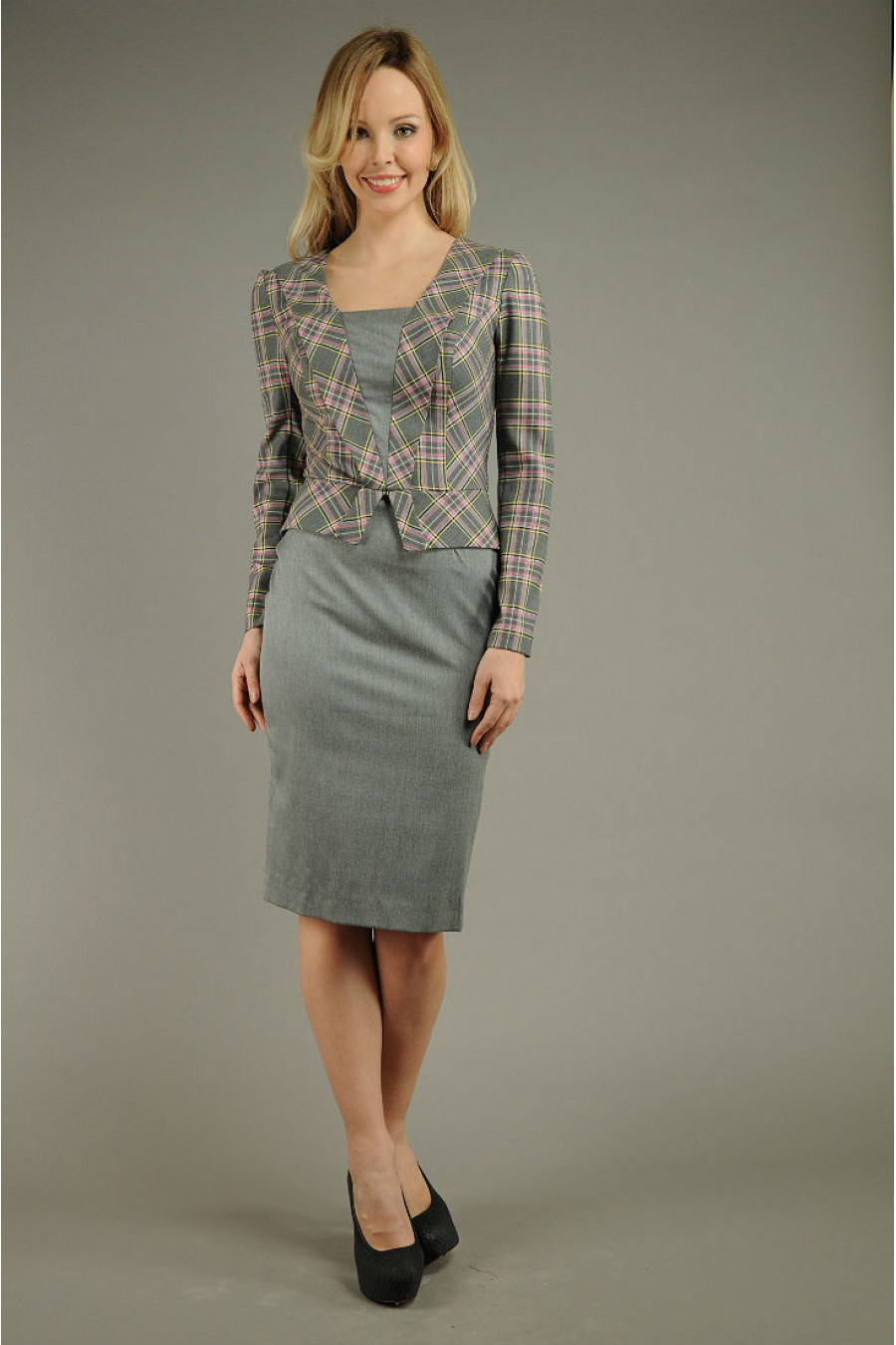 Очароавательная модель платья футляр - скромно и со вкусом. Отрезное по линии талии. Вшитый пиджак с элегантной баской. Верх - крупная клетка, низ - однотонный, сдержанный серый цвет. Длинный рукав. Модель идеально впишется для повседневного или офисного гардероба.