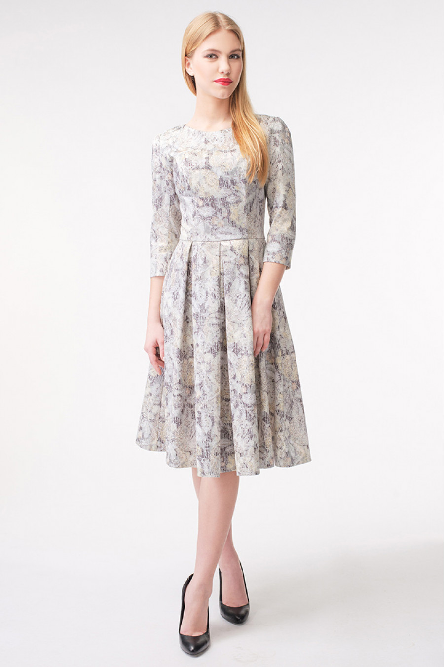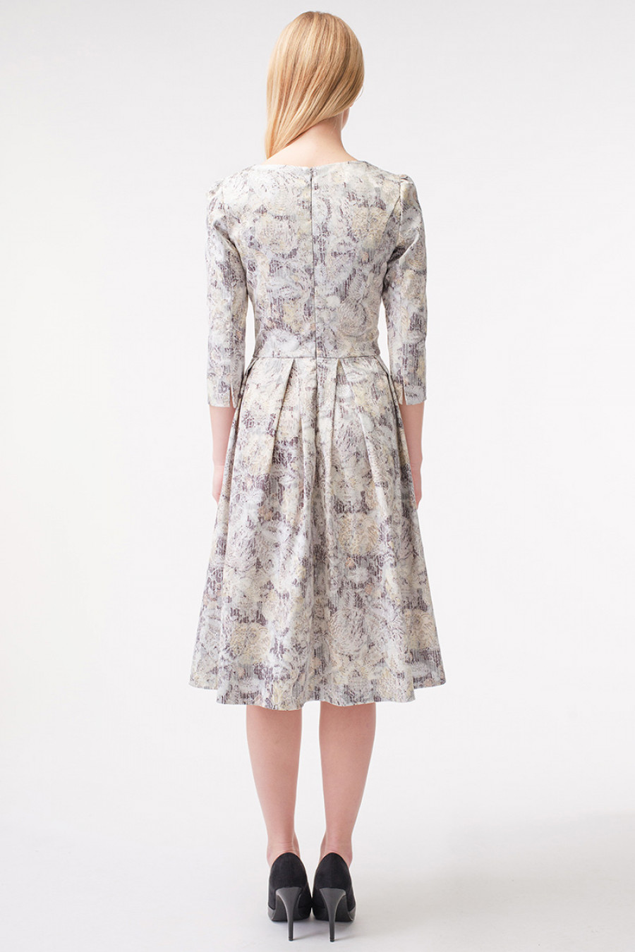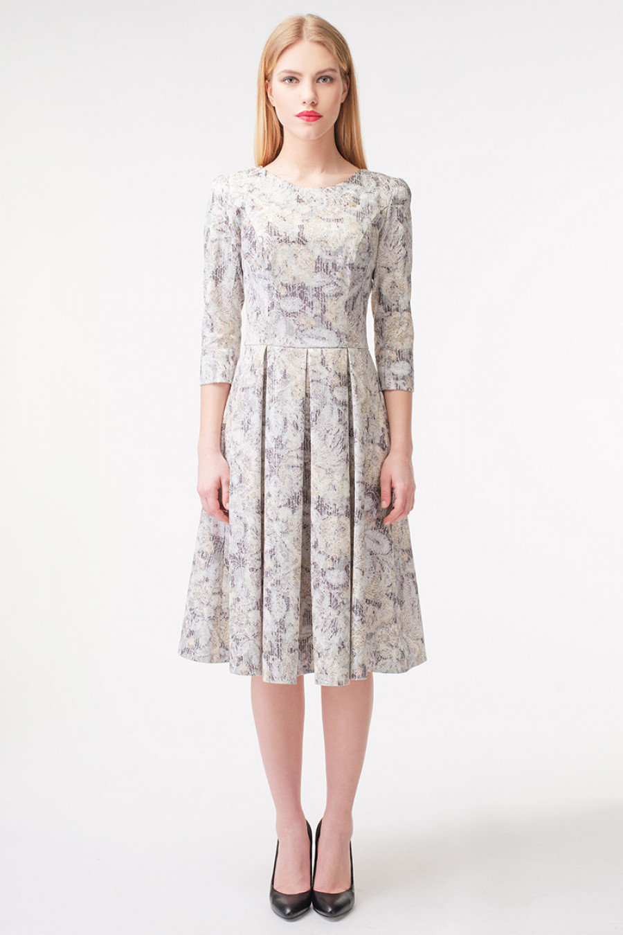 Классика от STELLA DI MARE. Романтичное и необыкновенно привлекательное хлопковое платье с защипами на юбке, сезона весна-лето. Рукава средней длины. Отрезное по линии талии. Округлый вырез. Изумительный едва заметный цветочный принт, на серебряном фоне. Это платье достойный вариант для офисной работы, прогулки и различных повседневных дел. Прекрасный подарок себе и близкой подруге.