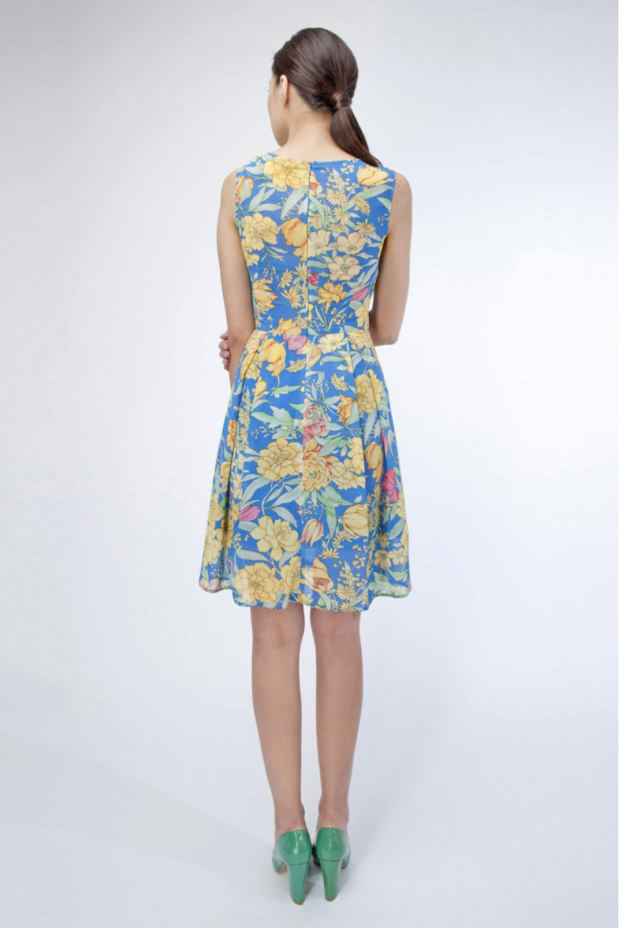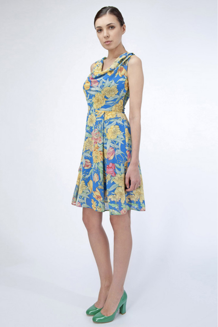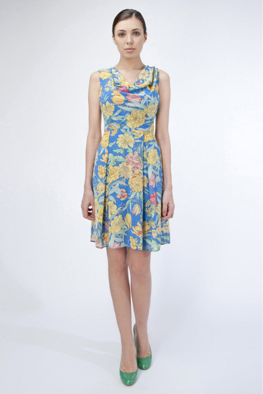 Удобное летнее платье сезона 2015 от STELLA DI MARE. Приятная на ощупь ткань. Защипы на юбке. К платью прилагается пояс! Длина выше колена. Без рукавов. Отрезное по линии талии. Яркий цветочный принт на синем фоне. Это платье достойный вариант, как для офисной работы, прогулки и различных повседневных дел. В нем Вы будете неотразимы везде, где бы не появились.