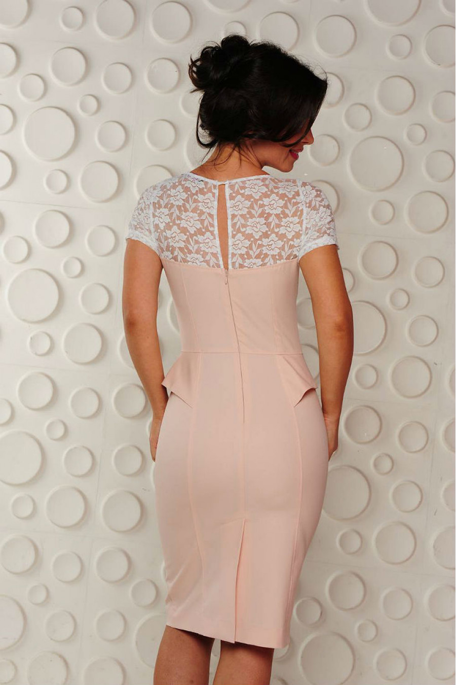 Воплощение нежности и романтичности. Платье футляр цвета чайной розы. Модный тренд сезона - баска. Линия груди и рукава декорированы полупрозрачной тканью с выбитыми цветами.