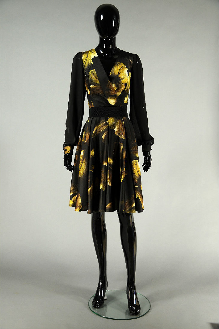 Восхитительная модель платье отличается своими игривыми складками, ведь от линии талии оно имеет расклешённый покрой. На фоне чёрной ткани расположены изящные синие цветы. Длинный рукав платья сшит из лёгкой полупрозрачной ткани. V - образный вырез. Длина до середины колена.