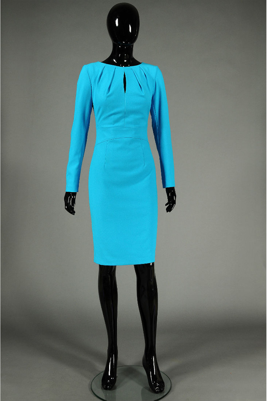 Известно, что платье - футляр как и юбка-карандаш является атрибутом высокого стиля и универсальности. Данная модель платья насыщенного голубого цвета очень освежает. Эластичная ткань придаёт фигуре изящности. Платье отрезное по линии талии. Длина - чуть выше колена. Длинный рукав. Изящный вырез - капелька и защиппы на линии груди. Высокий вырез-лодочка