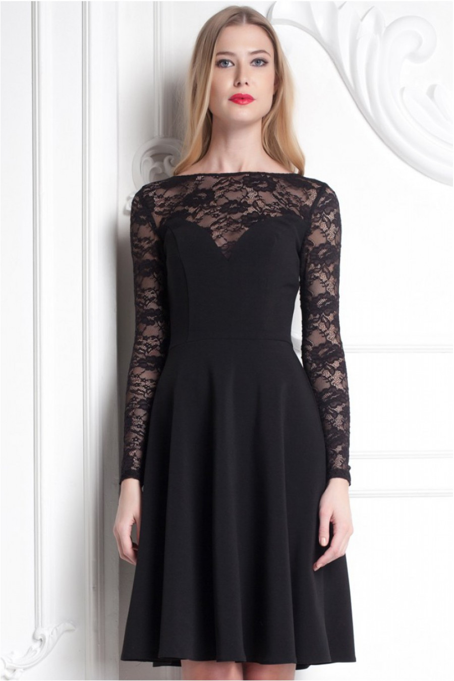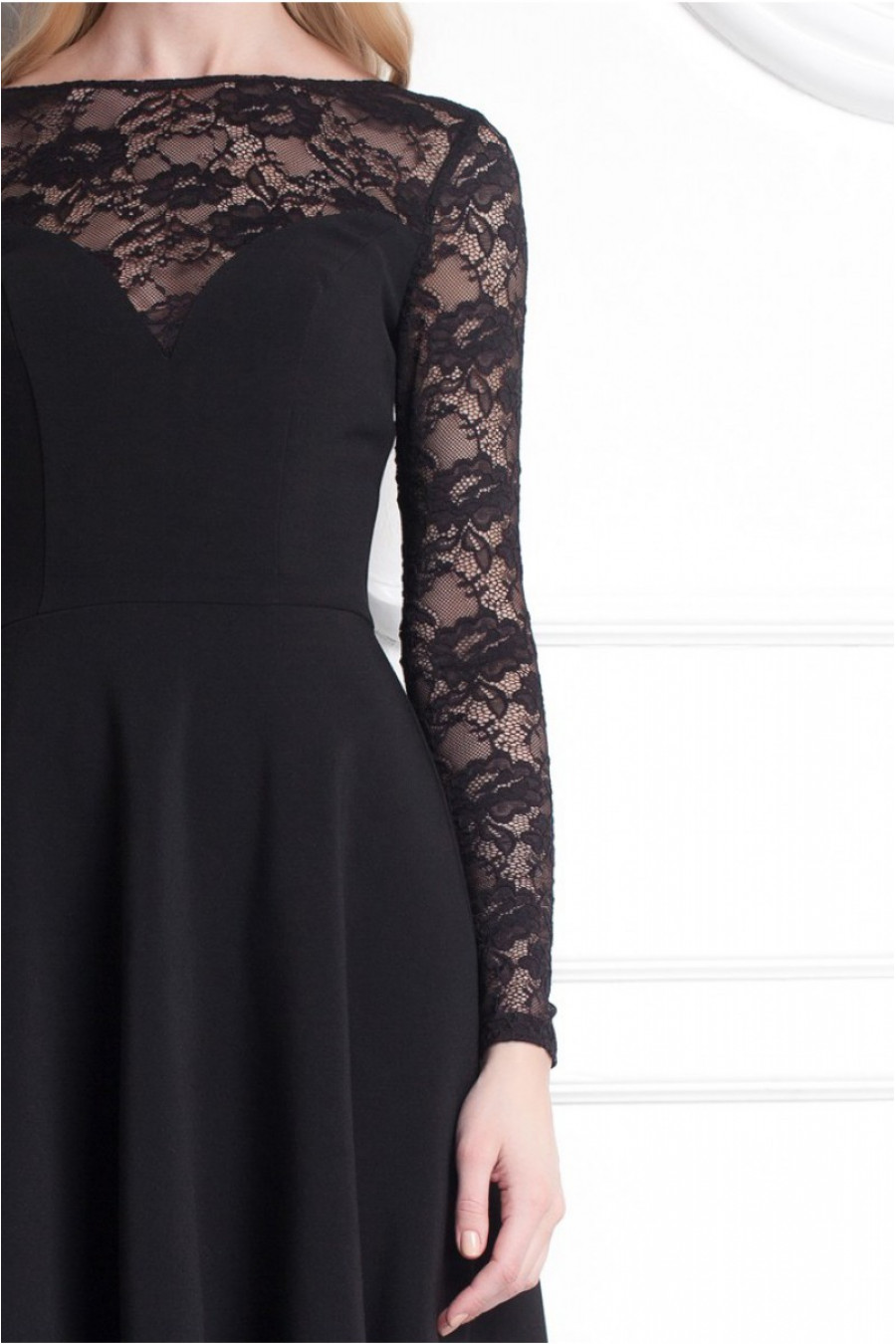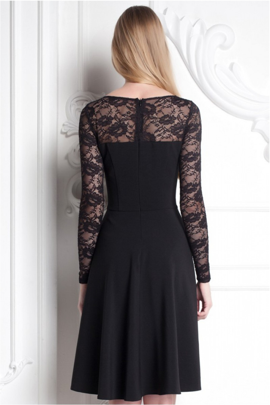 Stella Di Mare спешит представить Вам эксклюзивное платье с пышной юбкой темно - черного колорита. Модель данного платья имеет отличительную особенность: верхняя часть платья, спинка и длинный рукав украшен - гипюром из изящных цветочных рюш. Изящный тонкий ремешок прилагается в комплекте!