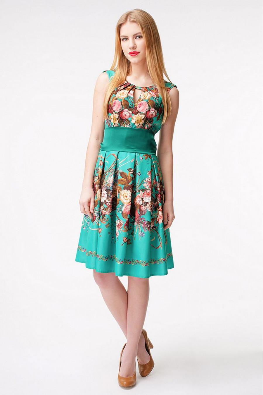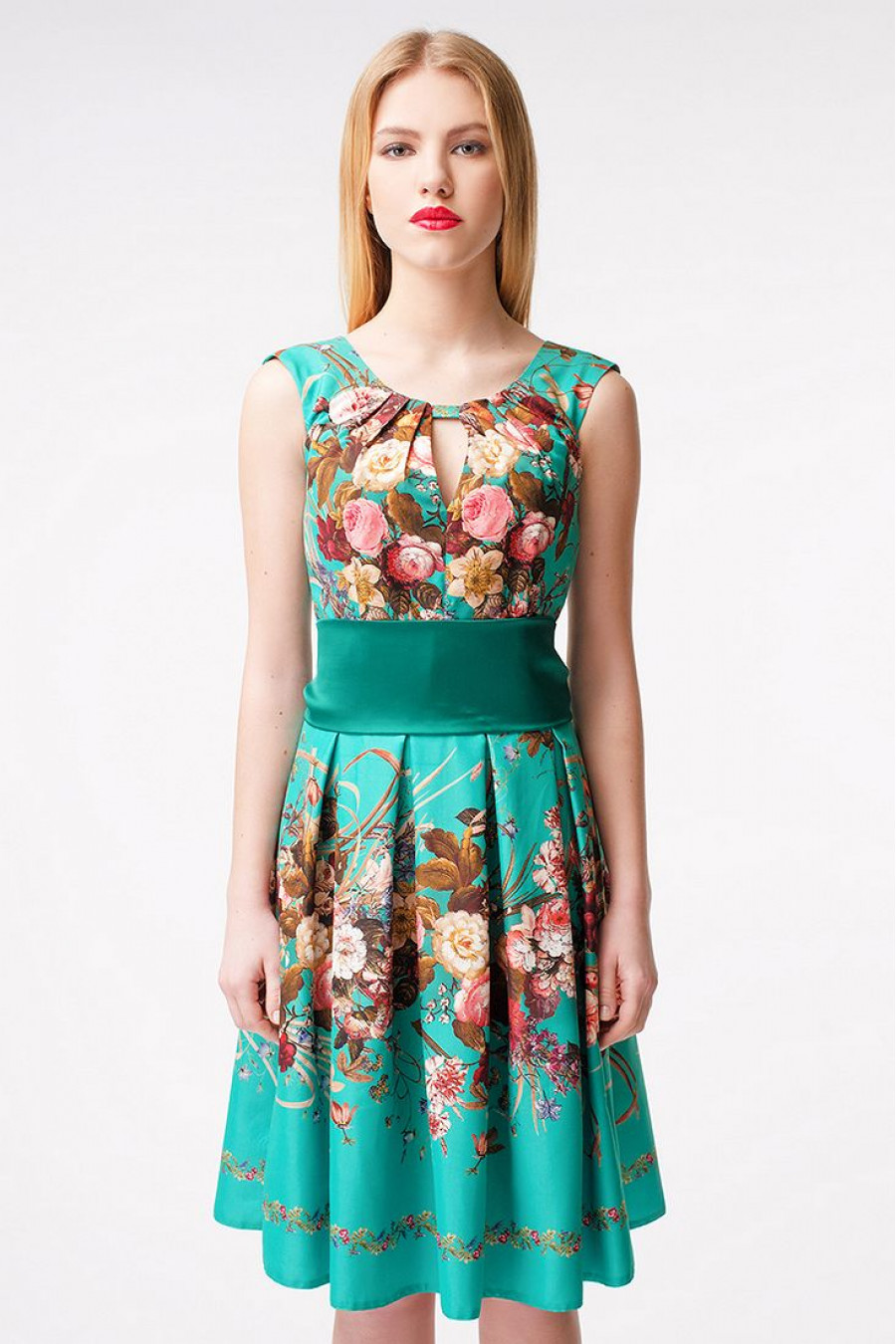 Необыкновенно привлекательная модель летнего платья, без рукавов и со складками на юбке. На фоне зеленой ткани расположены изящные разнообразные цветы нежных цветов. Талию прекрасно украшает и подчеркивает зеленый пояс, в унисон основному цвету платья. Длина до середины колена. Прекрасный вариант для наступающего лета!