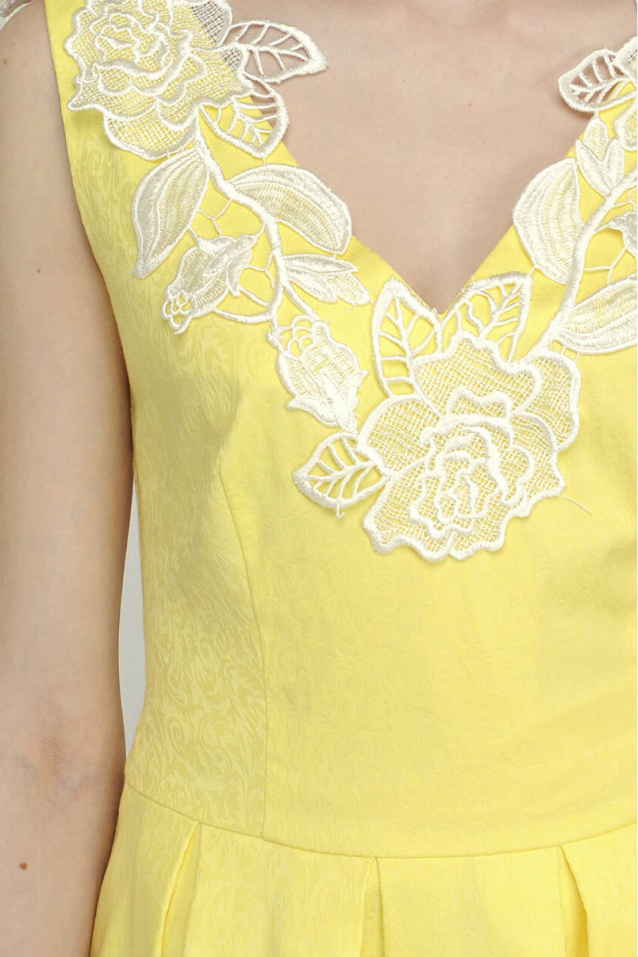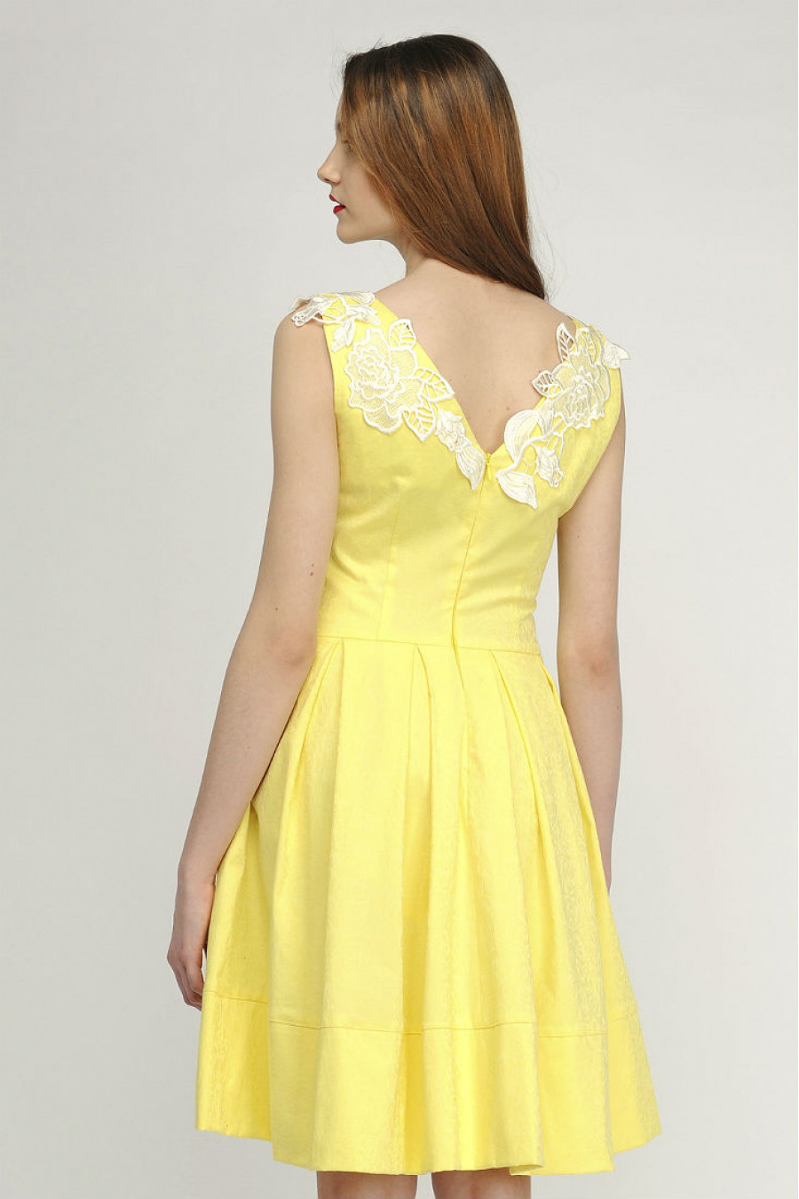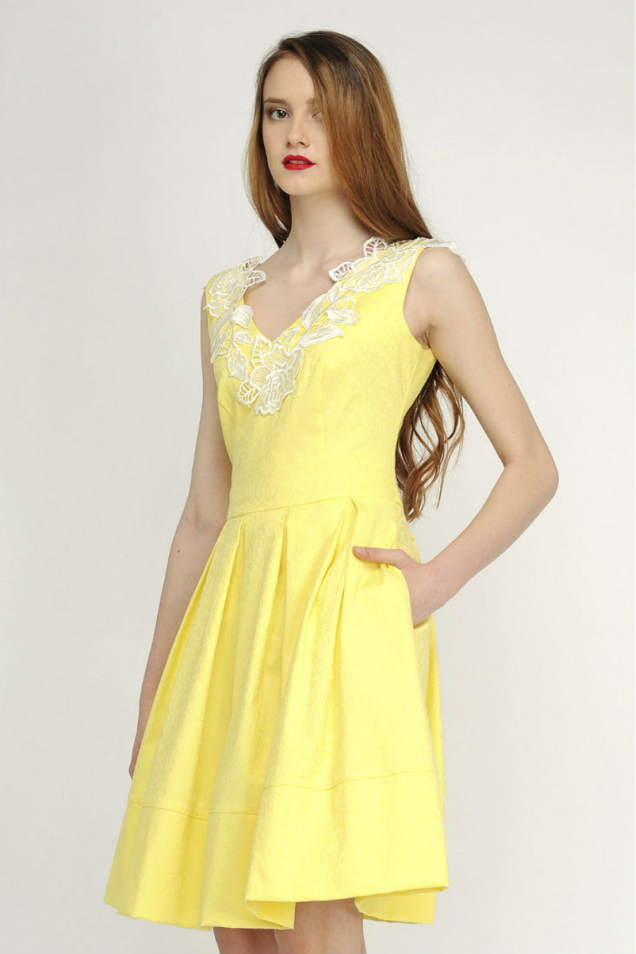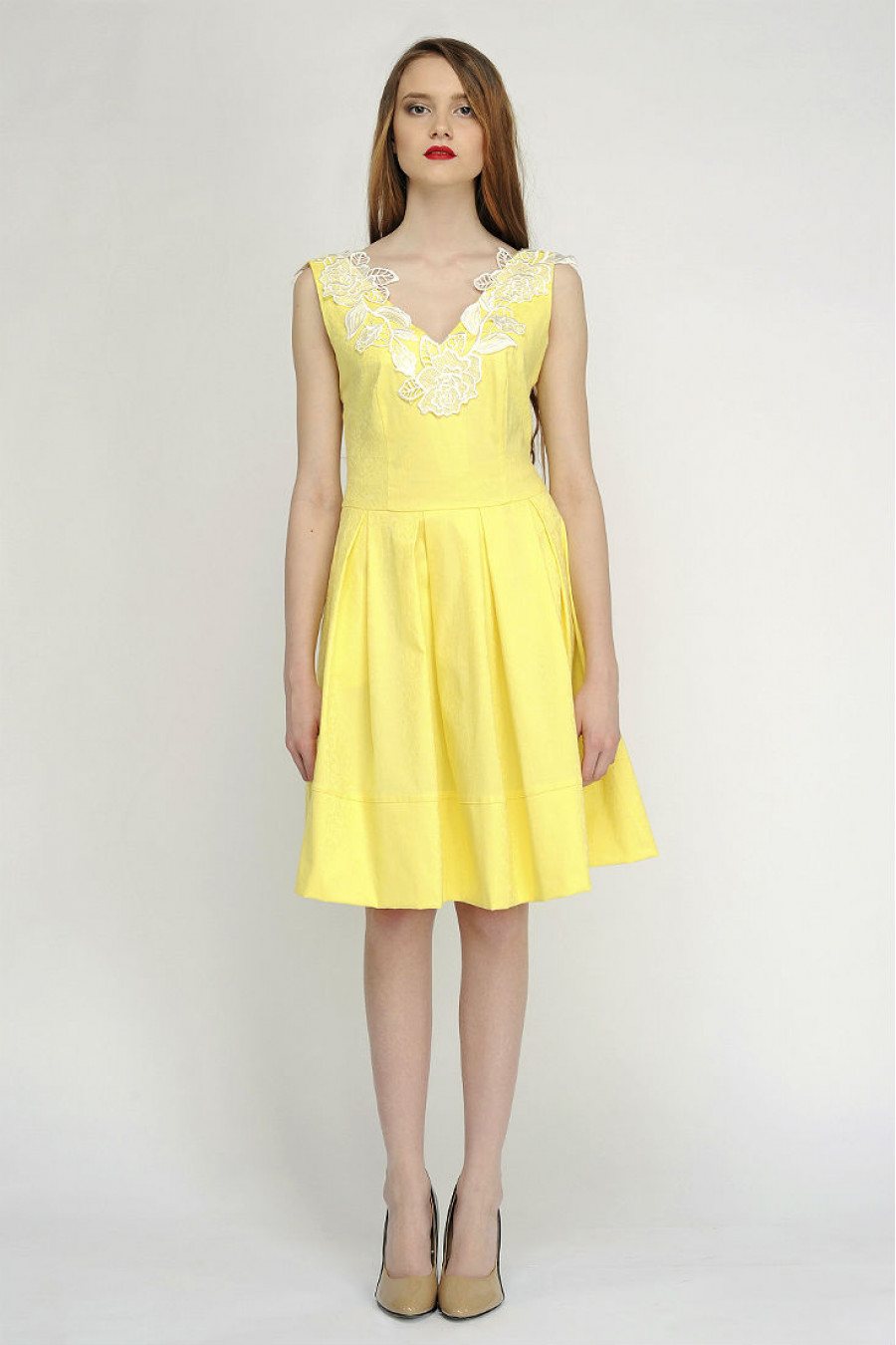 Яркое и солнечное летнее платье сезона 2015 от STELLA DI MARE. Приятная хлопковая ткань. Романтичное и необыкновенно привлекательное летнее хлопковое платье с защипами на юбке. Без рукавов. Отрезное по линии талии. V-ый вырез груди и спины, украшенный декоративной ожурной тканью в виде цветов. Насыщенный желтый цвет. Это платье достойный вариант, как для офисной работы, прогулки и различных повседневных дел, так и для какого-либо торжественного случая, например, выпускного или свадьбы подруги.