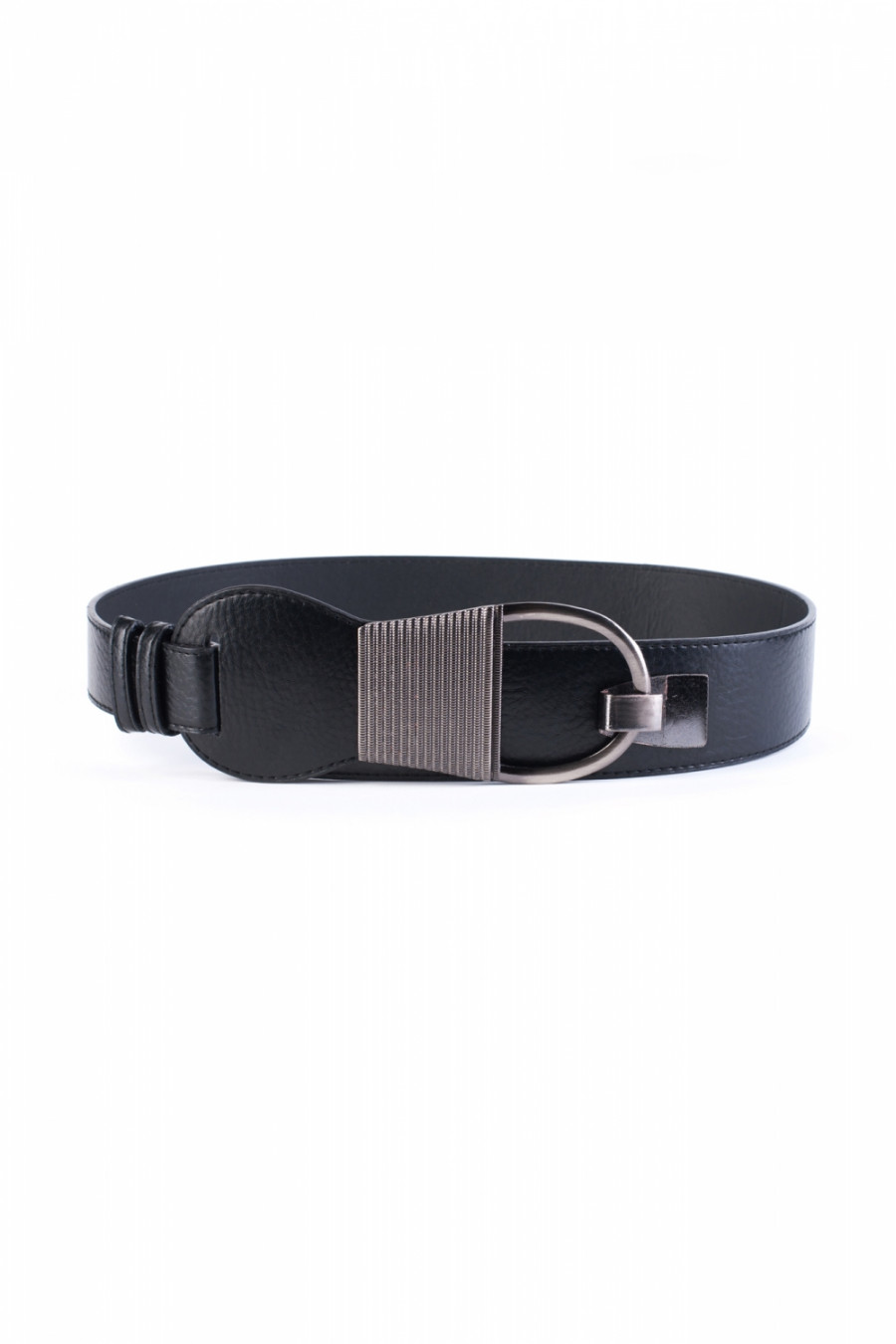 Оригинальный женский ремень из искусственной кожи. Необычная круглая форма пряжки, а также тип застегивания сразу привлекут внимание окружающих к этому аксессуару. Эта модель продается в одном черном цвете, который удачно сольется с любым строгим костюмом. С таким ремнем Ваш костюм станет более изысканным. Ширина 3,6 см.