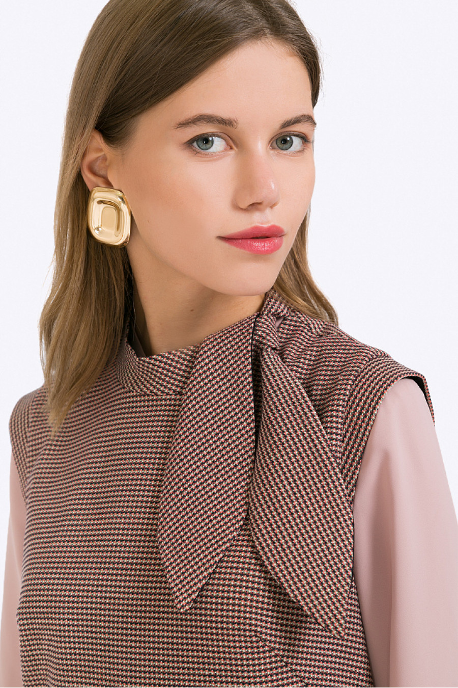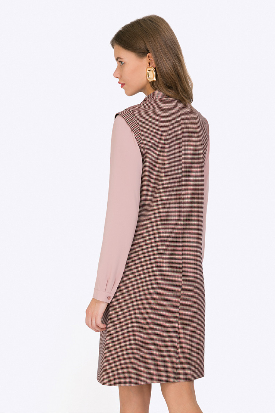 Платье-сарафан из ткани с фактурным плетением в контрастной чёрно-розовой цветовой гамме. Модель прямого покроя, свободно облегает фигуру. Верхняя часть пройм декорирована узкой полоской ткани, имитирующей крылышко. Центральным элементом композиционного решения являет ассиметрично завязывающийся в форме галстука воротник «аскот». В среднем заднем шве расположена «молния». Образ на фото дополнен Блузка B2300-oswal t . Рост фотомодели 174 см.
